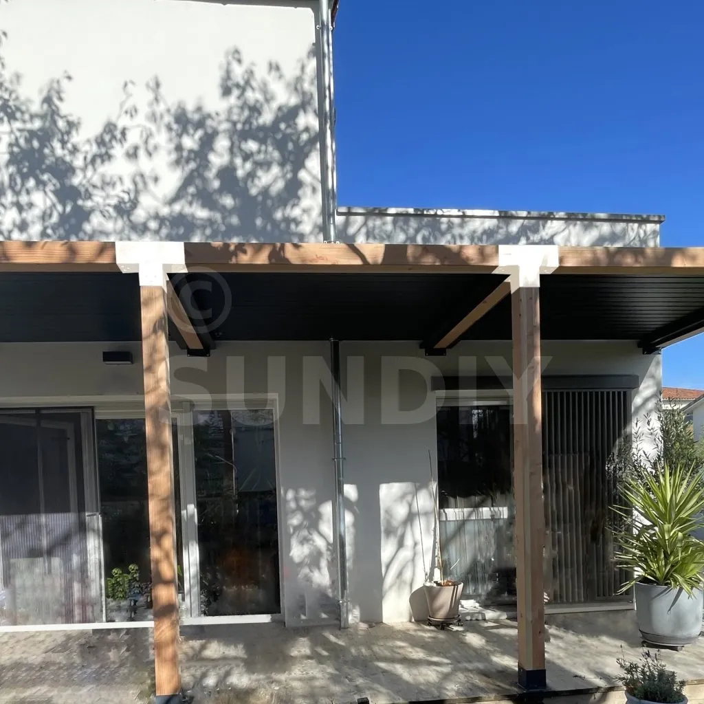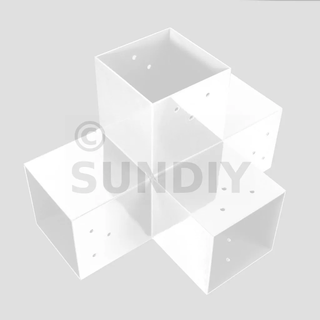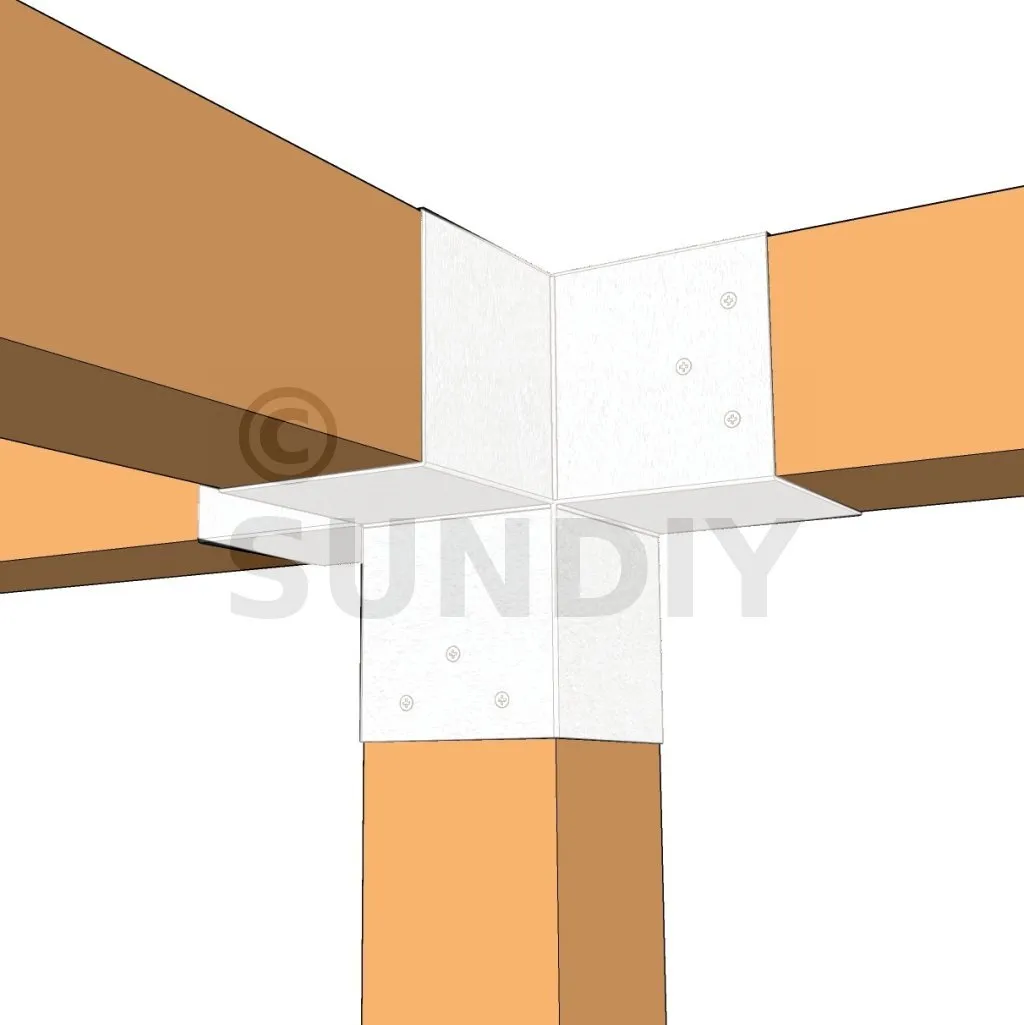 Il permet de raccorder une poutre de 120x120mm perpendiculairement à un chevron de 120x120mm, le tout étant supporté par un poteau vertical de 120x120mm.