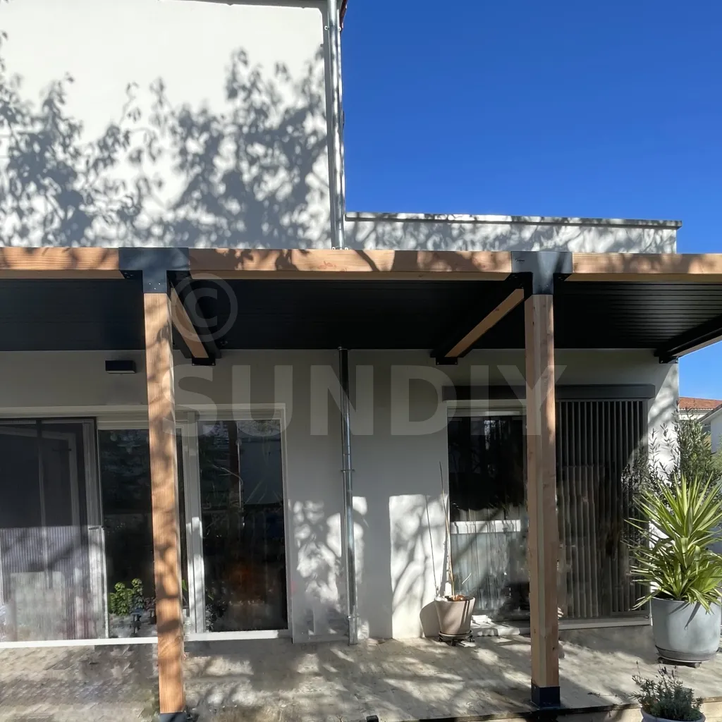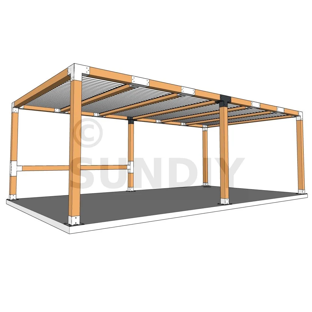 Il permet de raccorder une poutre de 120x120mm perpendiculairement à un chevron de 120x120mm, le tout étant supporté par un poteau vertical de 120x120mm.