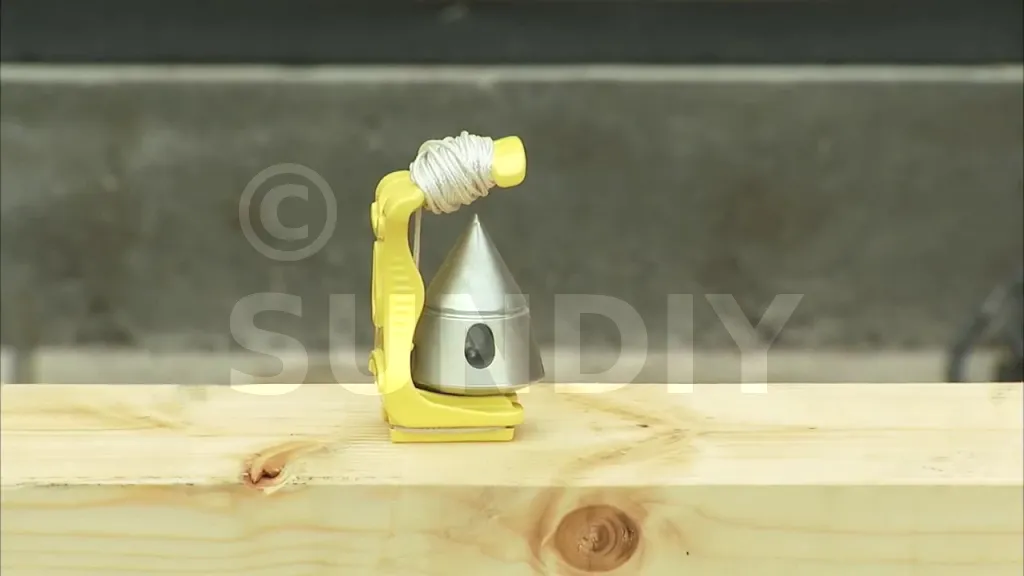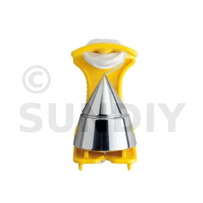 - d’une monture en polymère perforée de couleur jaune vif. La perforation permet de le fixer à une vis, des clous ou autres et de libérer la main de l’utilisateur, tandis que la couleur facilite son identification sur le chantier.