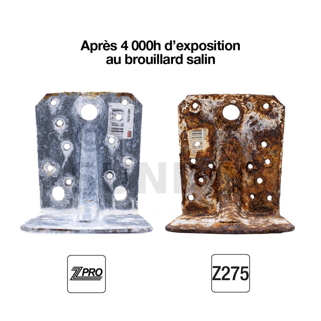 Le revêtement ZPRO présente une protection équivalente à une galvanisation à chaud de classe C3 selon la norme EN ISO 12944, ce qui permet aux connecteurs de cette gamme d’être utilisés en classe de service 3. En d’autres termes, ils offrent des performances similaires à celles des connecteurs en acier inoxydable A2.