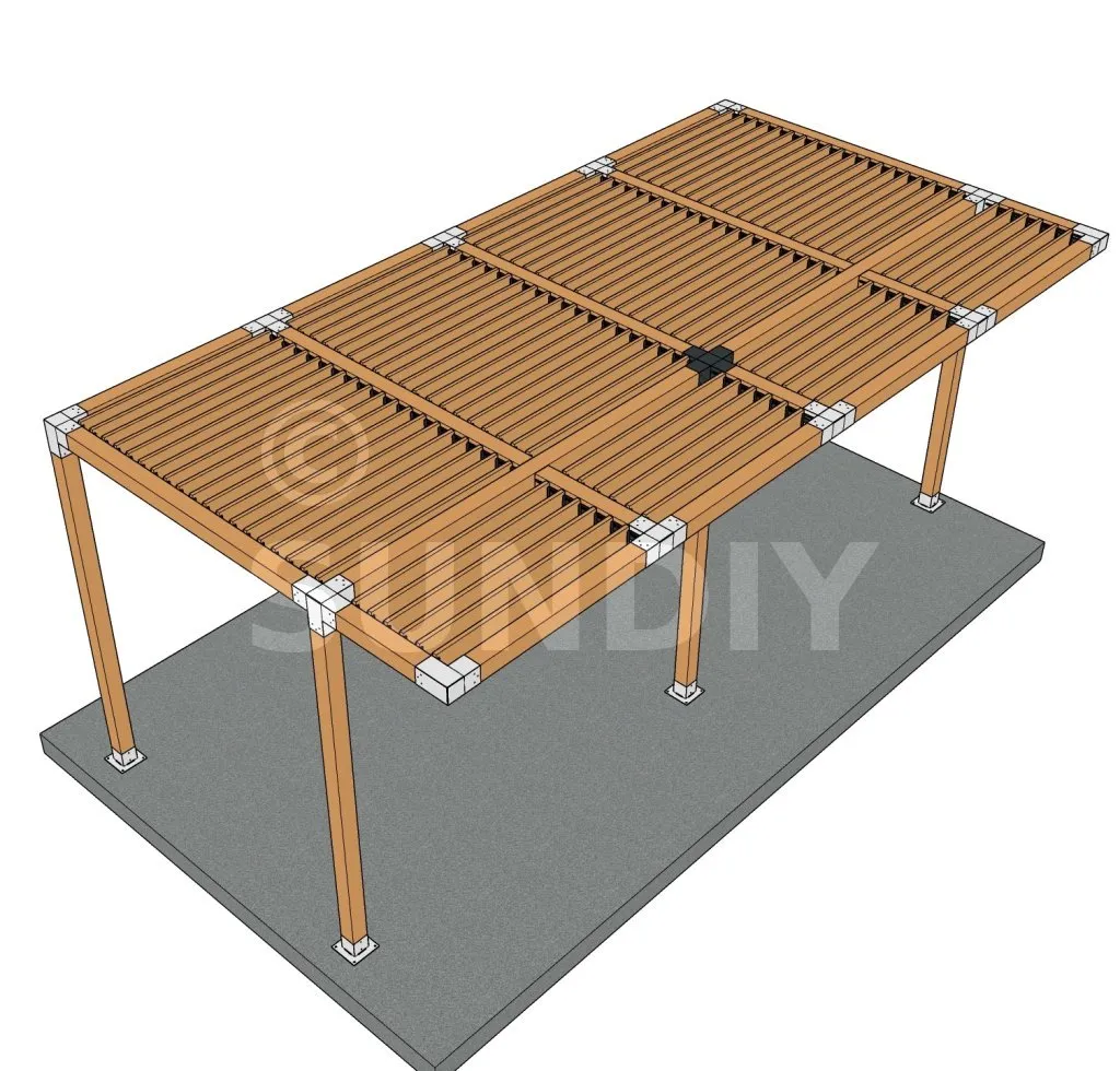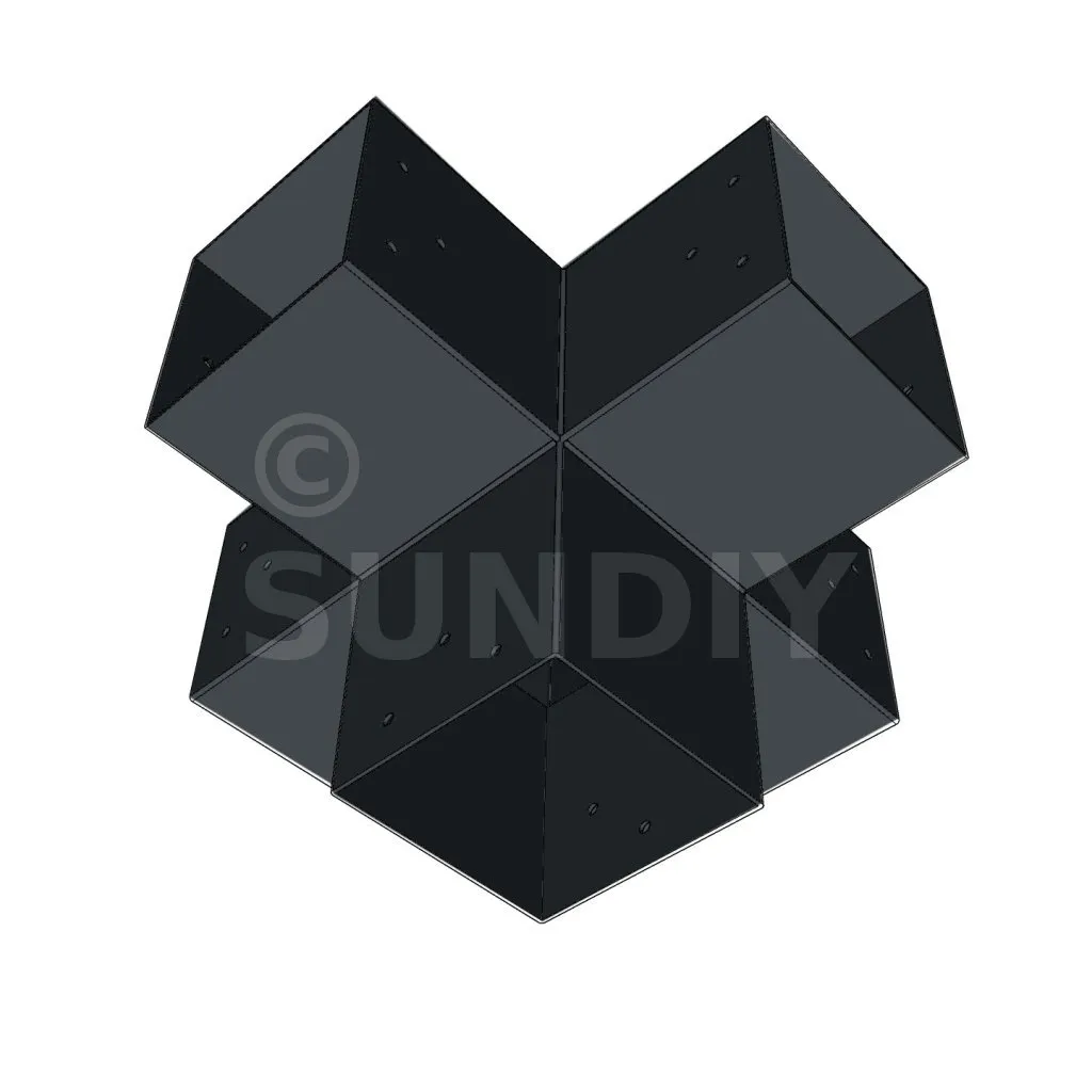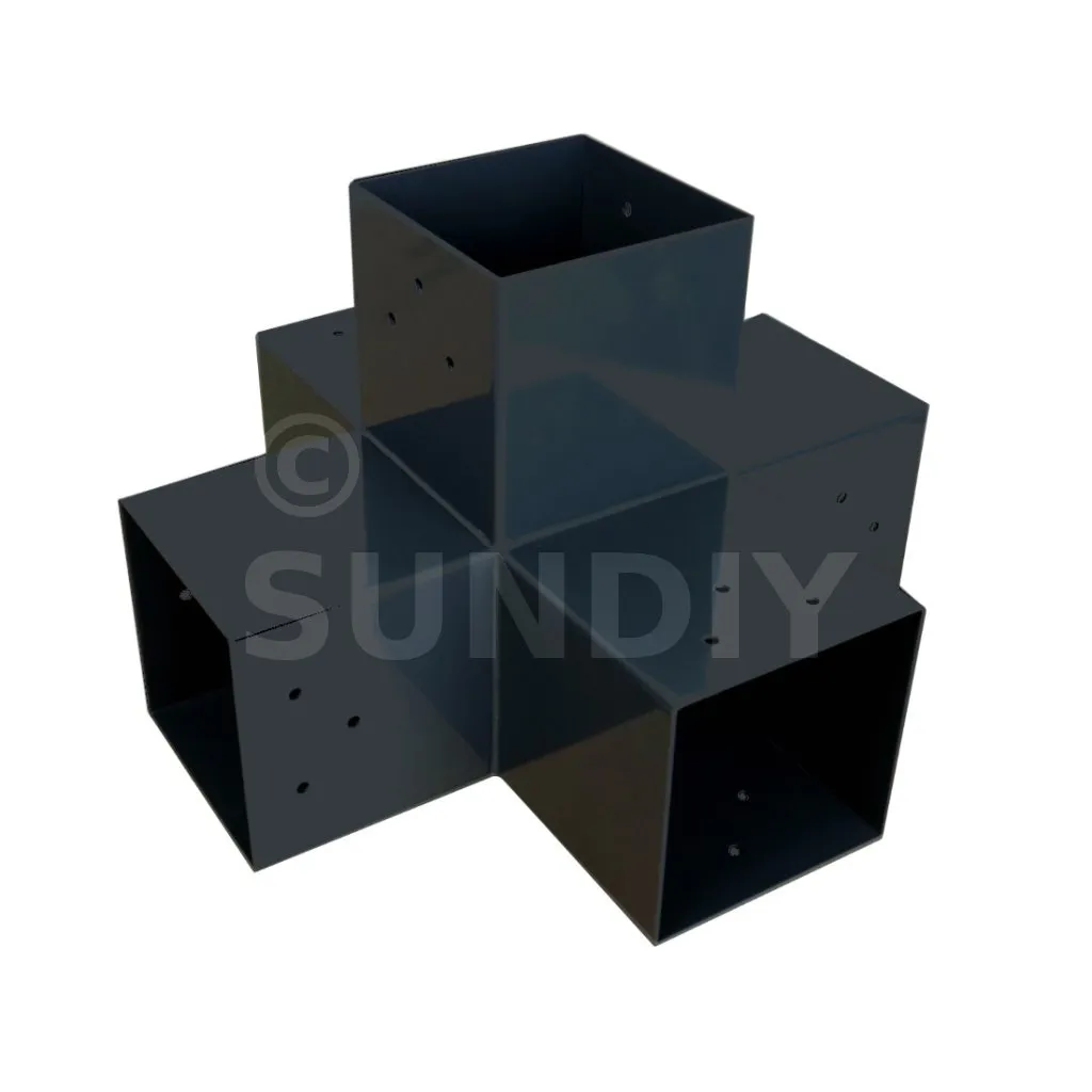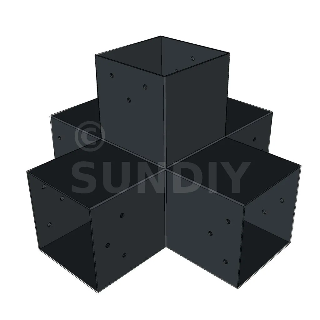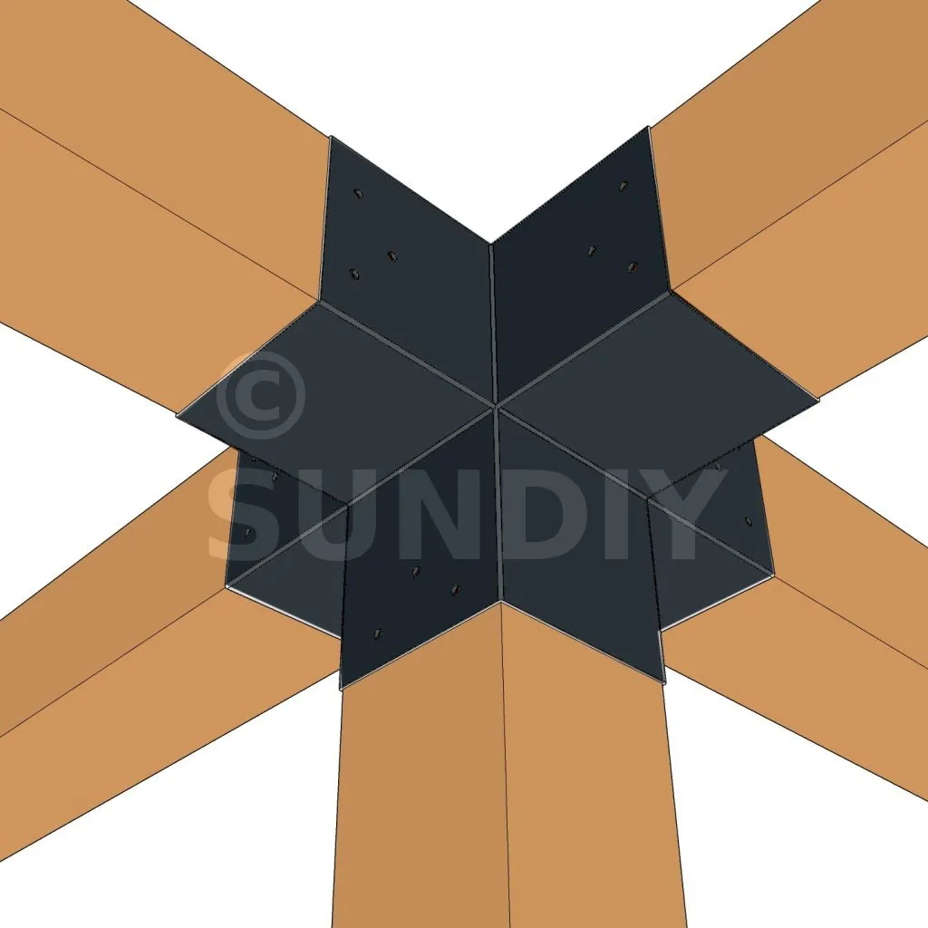 Il permet de raccorder deux poutres 120x120mm perpendiculairement à une autre poutre 120x120mm, le tout étant supporté par un poteau vertical de 120x120mm.