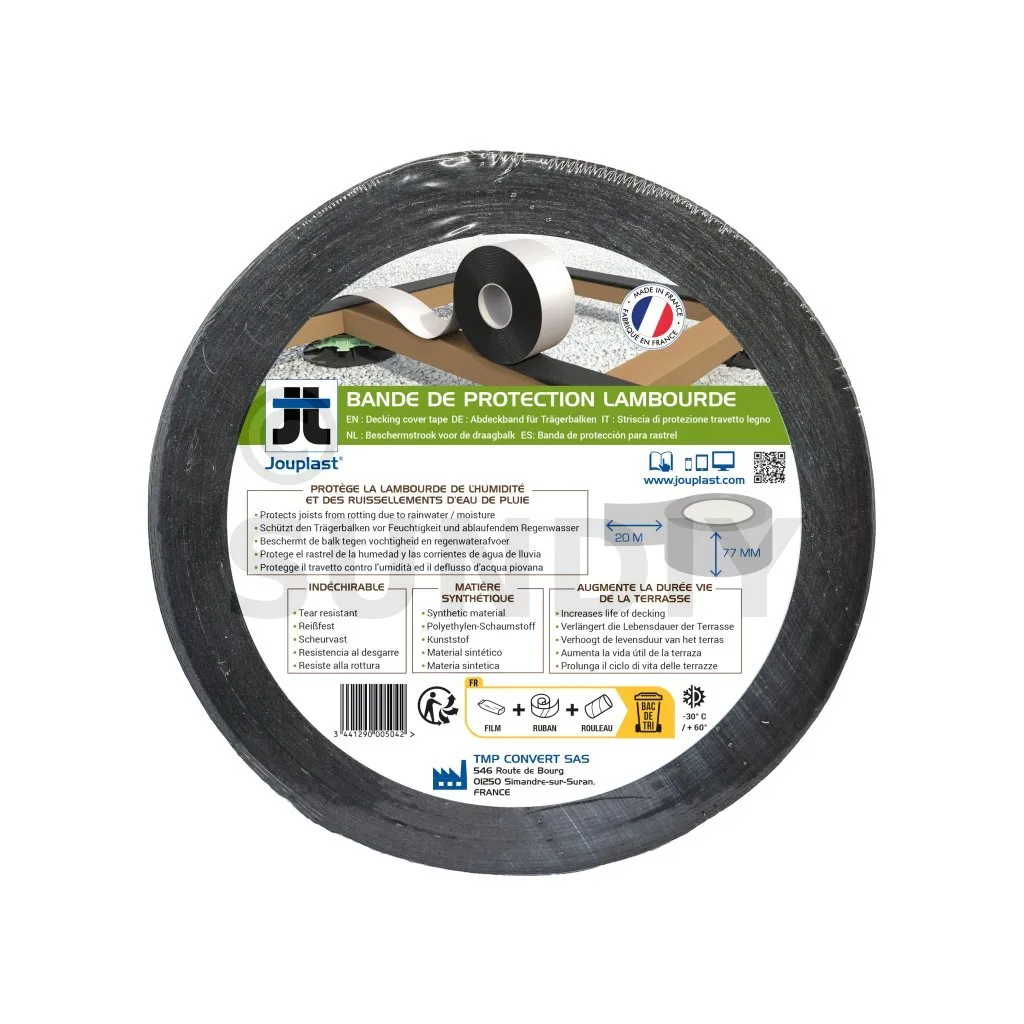 Cette bande a pour rôle d’étanchéifier les lambourdes constituant la structure de votre terrasse pour rendre votre ouvrage plus pérenne. En effet, les ruissellements des eaux de pluie ne vont plus s’attaquer aux lambourdes, ce qui évitera le pourrissement de ces derniers.