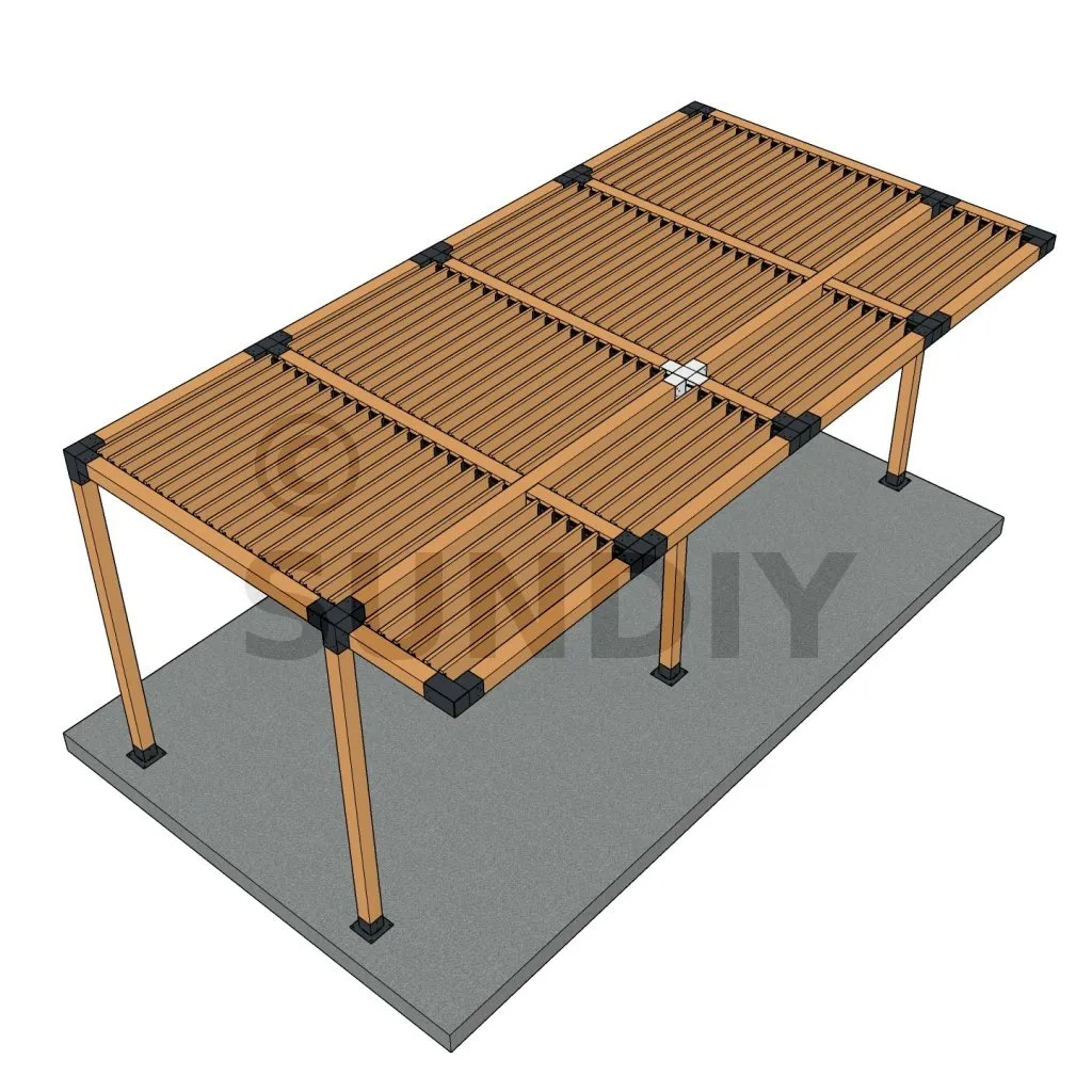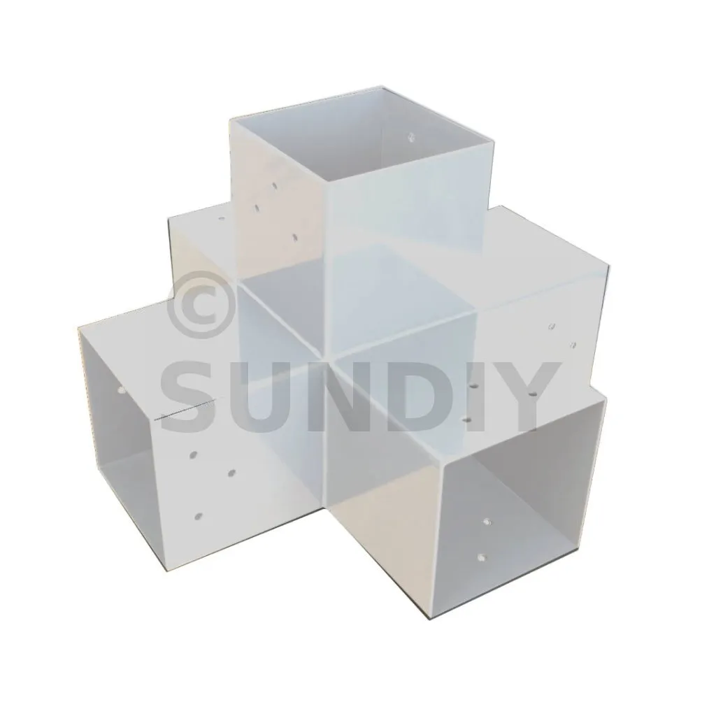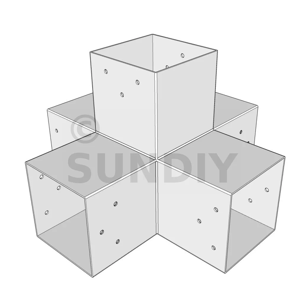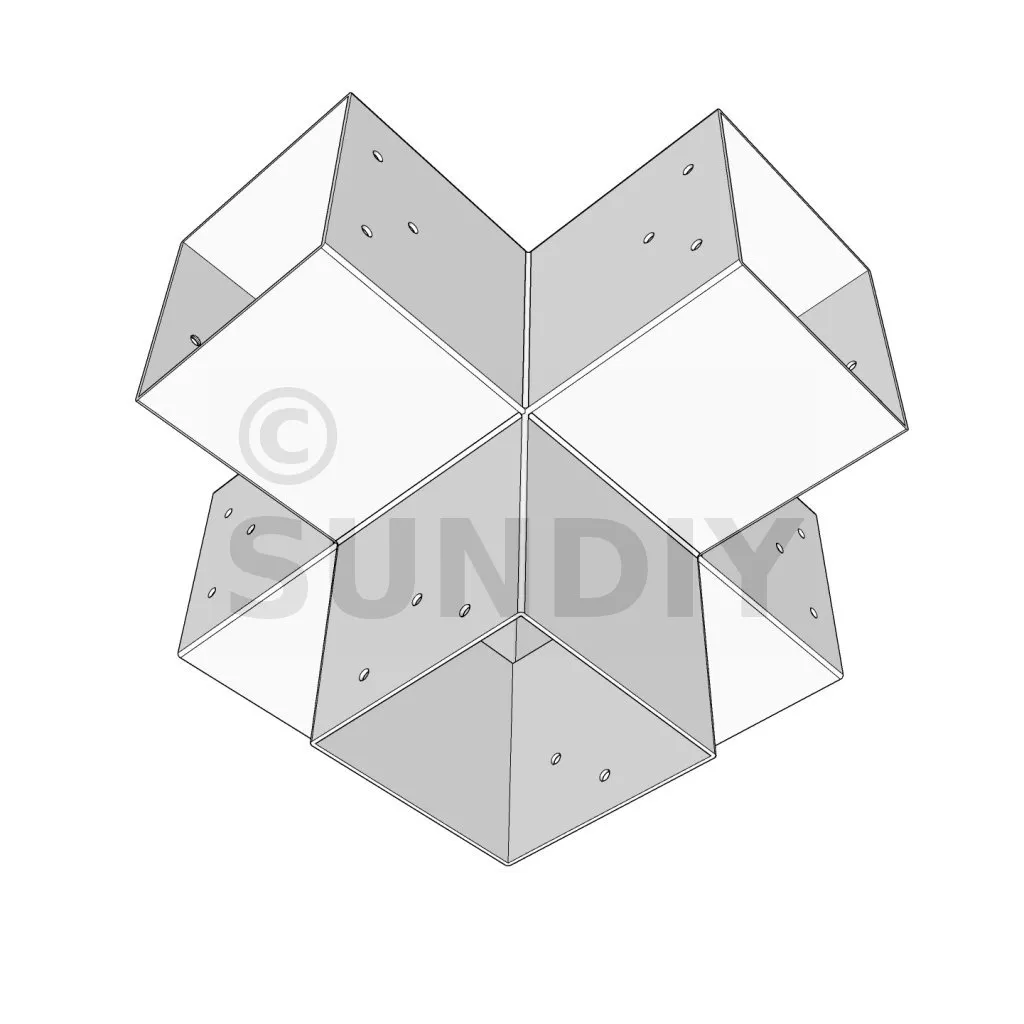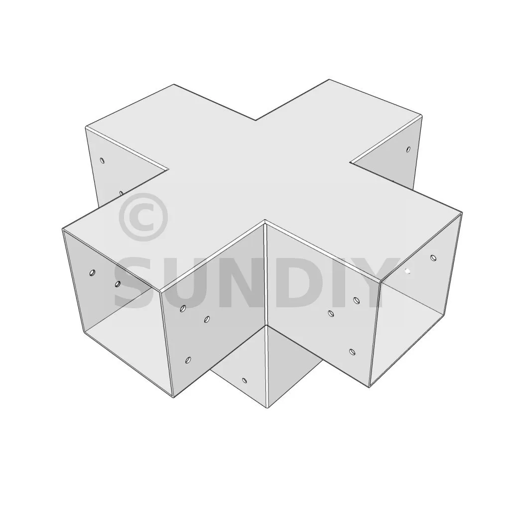 Il permet de raccorder deux poutres 120x120mm perpendiculairement à une autre poutre 120x120mm, le tout étant supporté par un poteau vertical de 120x120mm.