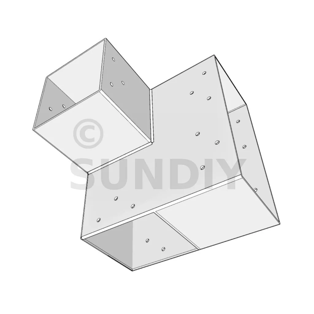 Il est utilisé dans un angle extérieur. Ce connecteur va permettre de raccorder une grosse poutre 240x120mm perpendiculairement à une poutre 120x120mm, le tout étant supporté par un poteau vertical 120x120 mm.