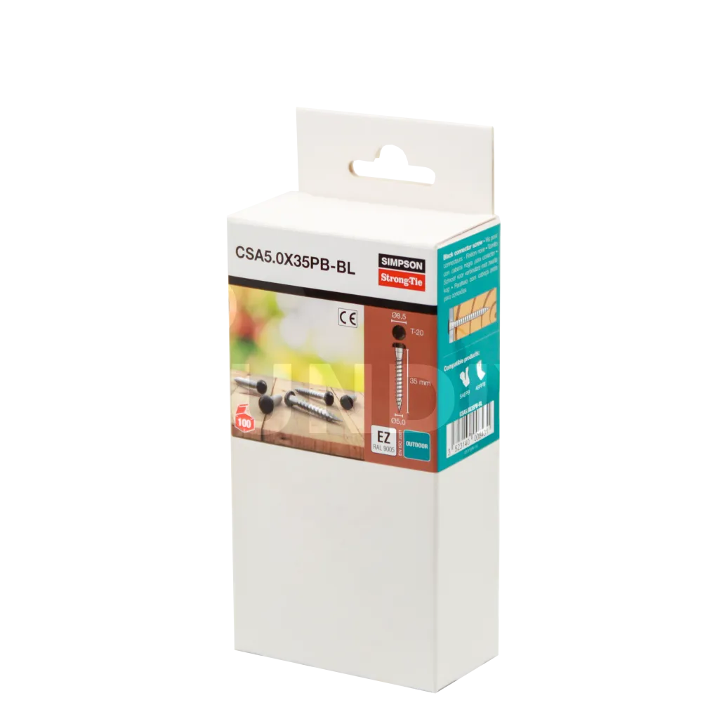 Les vis CSA5.0x40ZPB ont été étudiées pour la mise en œuvre discrète des équerres et des connecteurs en finition noire. Leur tête conique assure un contact complet avec le connecteur. L’empreinte étoile permet de maintenir la vis lors du montage.
