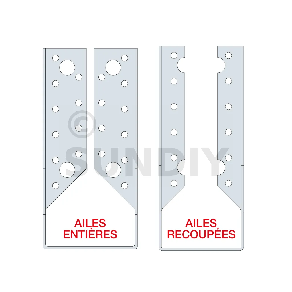 Le sabot à ailes intérieures SAI est une variante du sabot à ailes extérieures qui permet d’apporter une plus grande discrétion dans l’assemblage. Son utilisation permet de répondre à des cas particuliers tels les assemblages en coin.