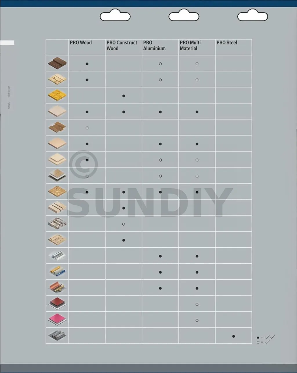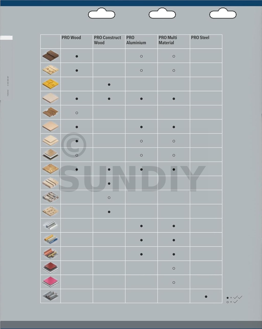 Pour la colonne PRO Multi-Matériaux, les matériaux compatibles avec la lame sont ceux mentionnés dans le chapitre Caractéristiques. Les matériaux pouvant être découpés mais de manière moins optimale sont le bois dur, le bois résineux, les panneaux plastifiés et le HPL stratifié haute pression.