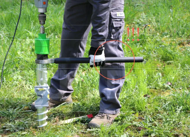 - La poignée permet à l’utilisateur de saisir l’outil fermement et d’appliquer le couple nécessaire pour visser la vis de fondation dans le sol. Sans une bonne poignée, il serait difficile d’exercer la force nécessaire pour enfoncer la vis.