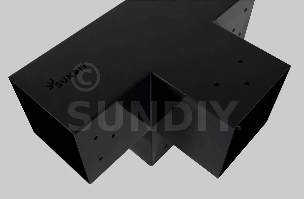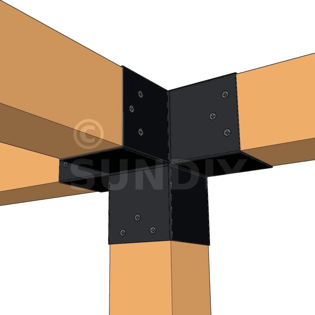 Il permet de raccorder une poutre de 90x90mm perpendiculairement à un chevron de 90x90mm, le tout étant supporté par un poteau vertical de 90x90mm.