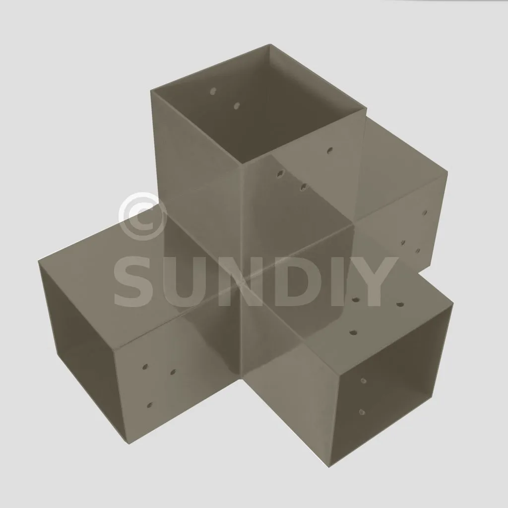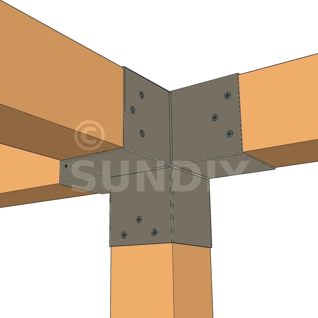Il permet de raccorder une poutre de 90x90mm perpendiculairement à un chevron de 90x90mm, le tout étant supporté par un poteau vertical de 90x90mm.
