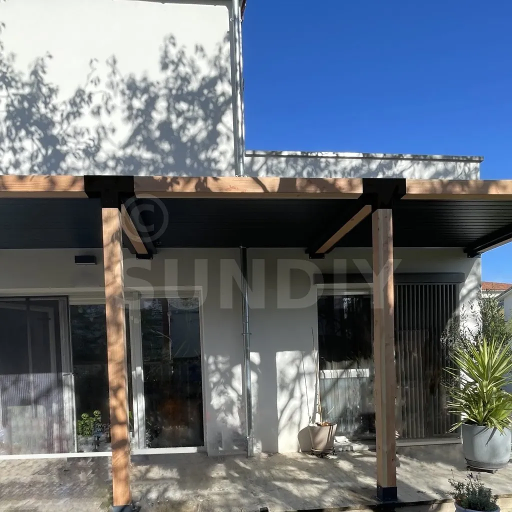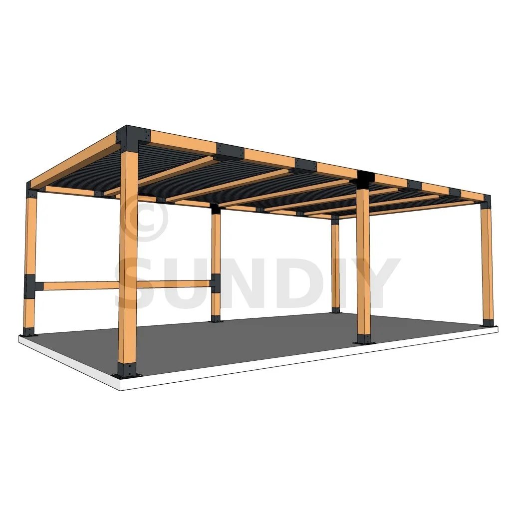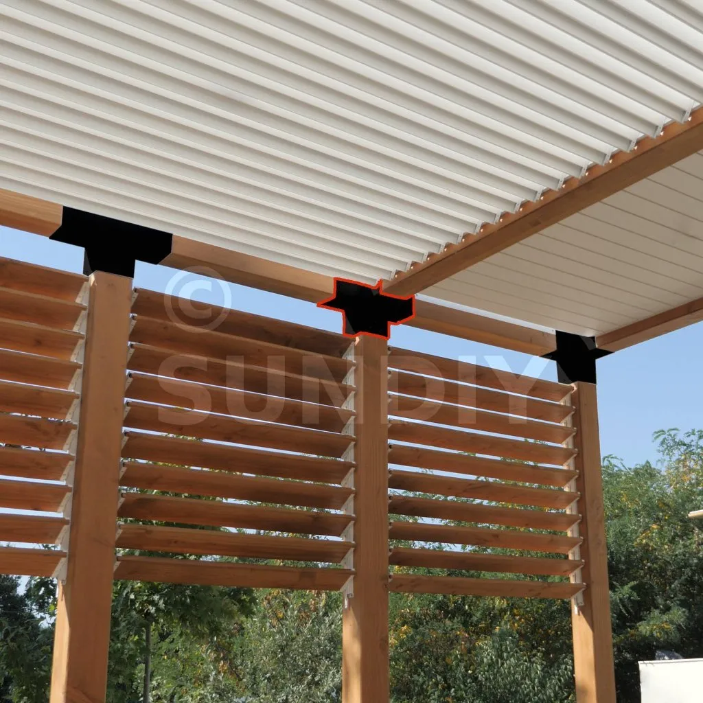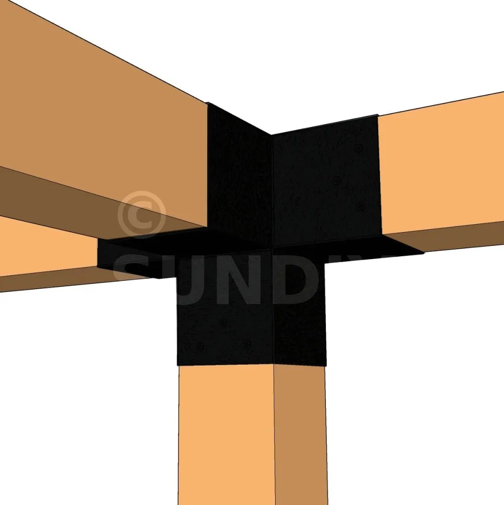 Il permet de raccorder une poutre de 120x120mm perpendiculairement à un chevron de 120x120mm, le tout étant supporté par un poteau vertical de 120x120mm.