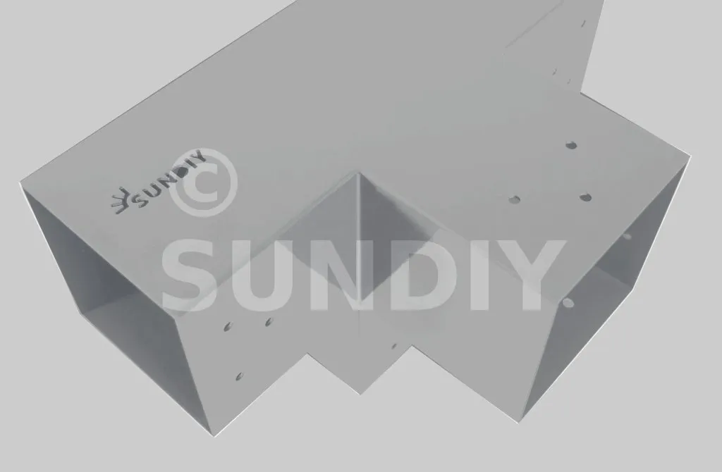 Il permet de raccorder une poutre de 120x120mm perpendiculairement à un chevron de 120x120mm, le tout étant supporté par un poteau vertical de 120x120mm.