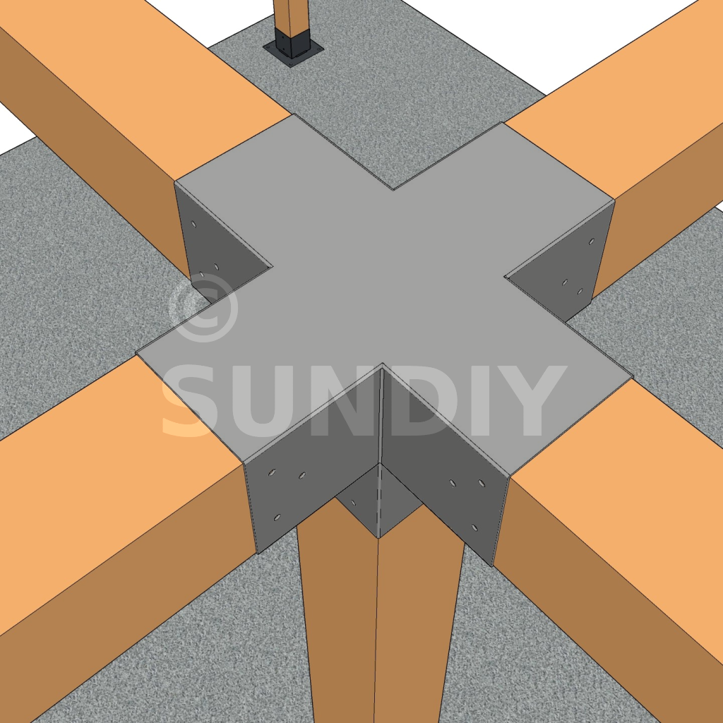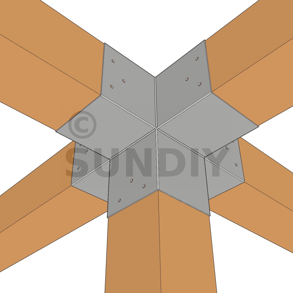 Il permet de raccorder deux poutres 120x120mm perpendiculairement à une autre poutre 120x120mm, le tout étant supporté par un poteau vertical de 120x120mm.
