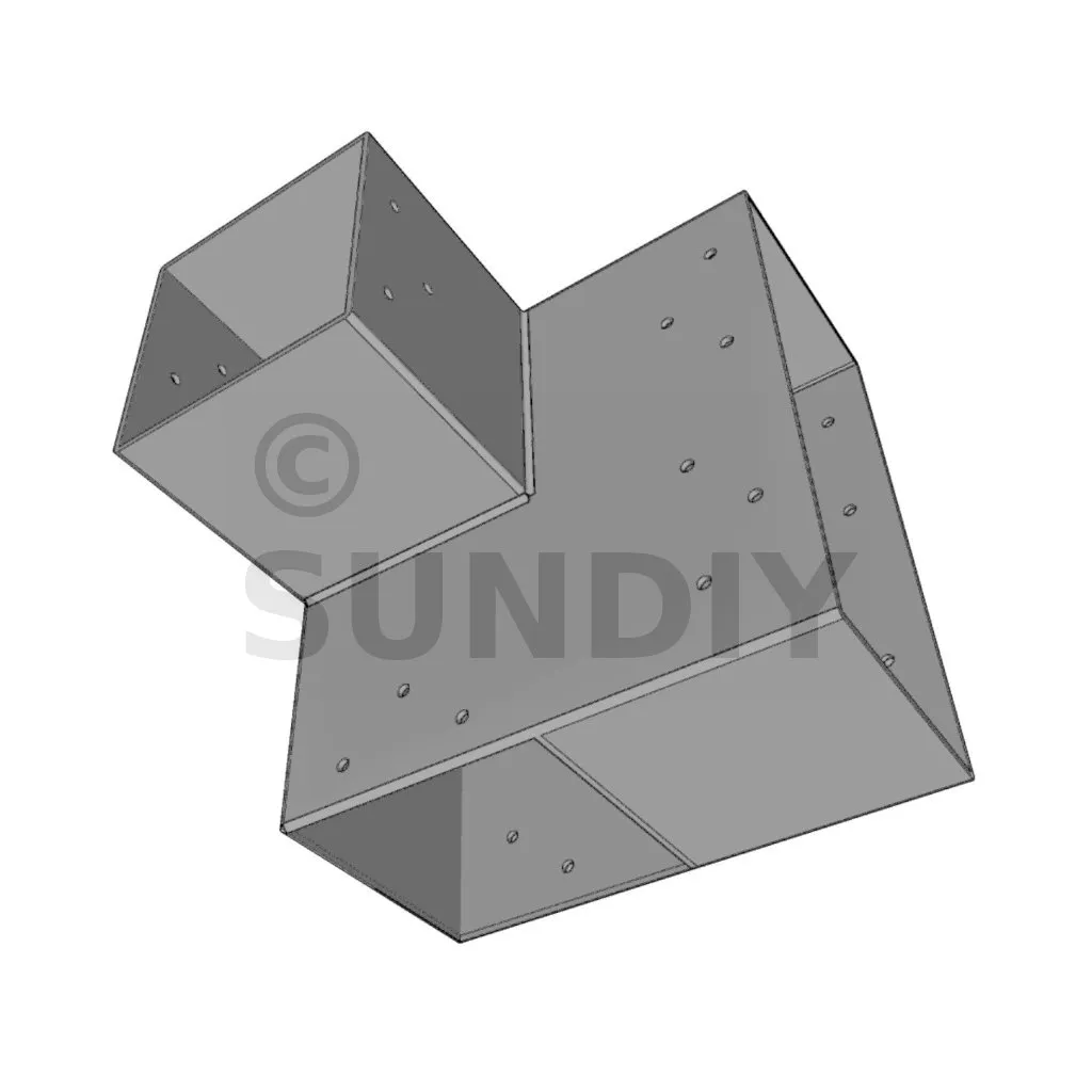 Il est utilisé dans un angle extérieur. Ce connecteur va permettre de raccorder une grosse poutre 240x120mm perpendiculairement à une poutre 120x120mm, le tout étant supporté par un poteau vertical 120x120 mm.
