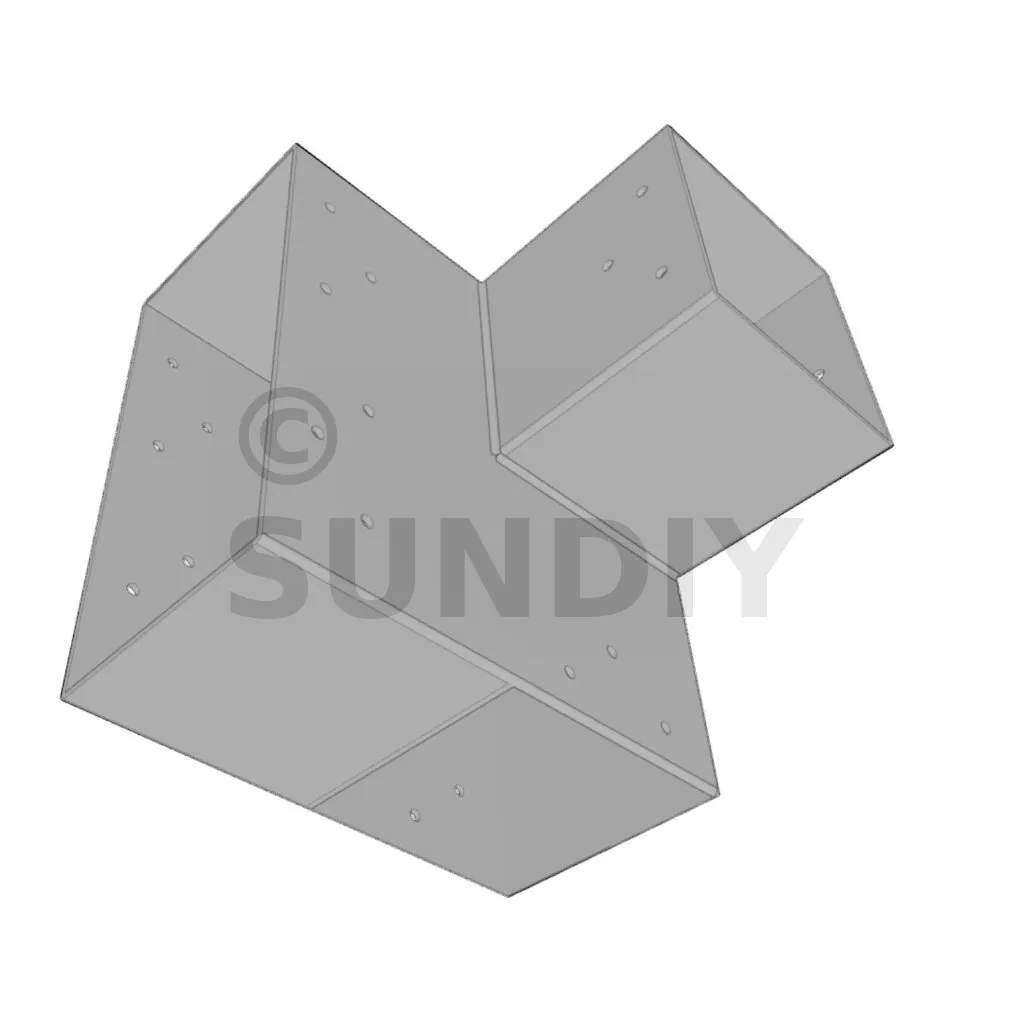 Il est utilisé dans un angle extérieur. Ce connecteur va permettre de raccorder une grosse poutre 240x120mm perpendiculairement à une poutre 120x120mm, le tout étant supporté par un poteau vertical 120x120mm.