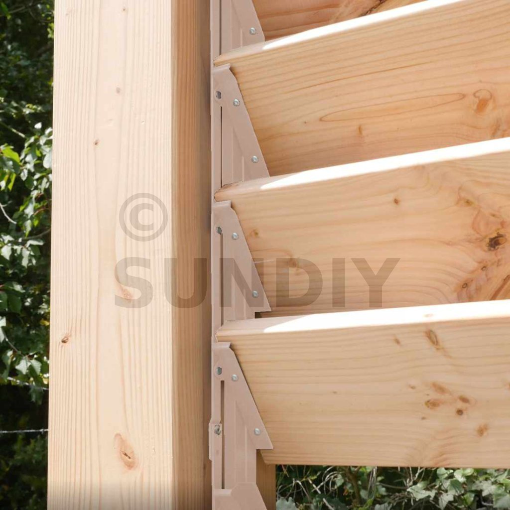 Les mécanismes constituent la base du SUNDIY. Ils permettent de couvrir une hauteur (ou profondeur) de 51cm, et jusqu’à une largeur de 150cm (conseillé) avec des lames en bois. Il est possible d’aller jusqu’à 200cm, mais le travail du bois risque d’être plus important au fil des ans.