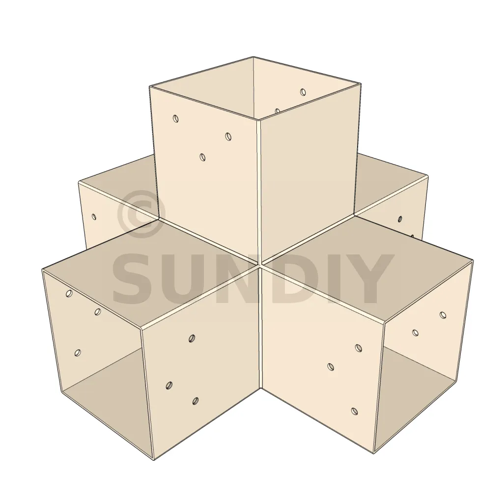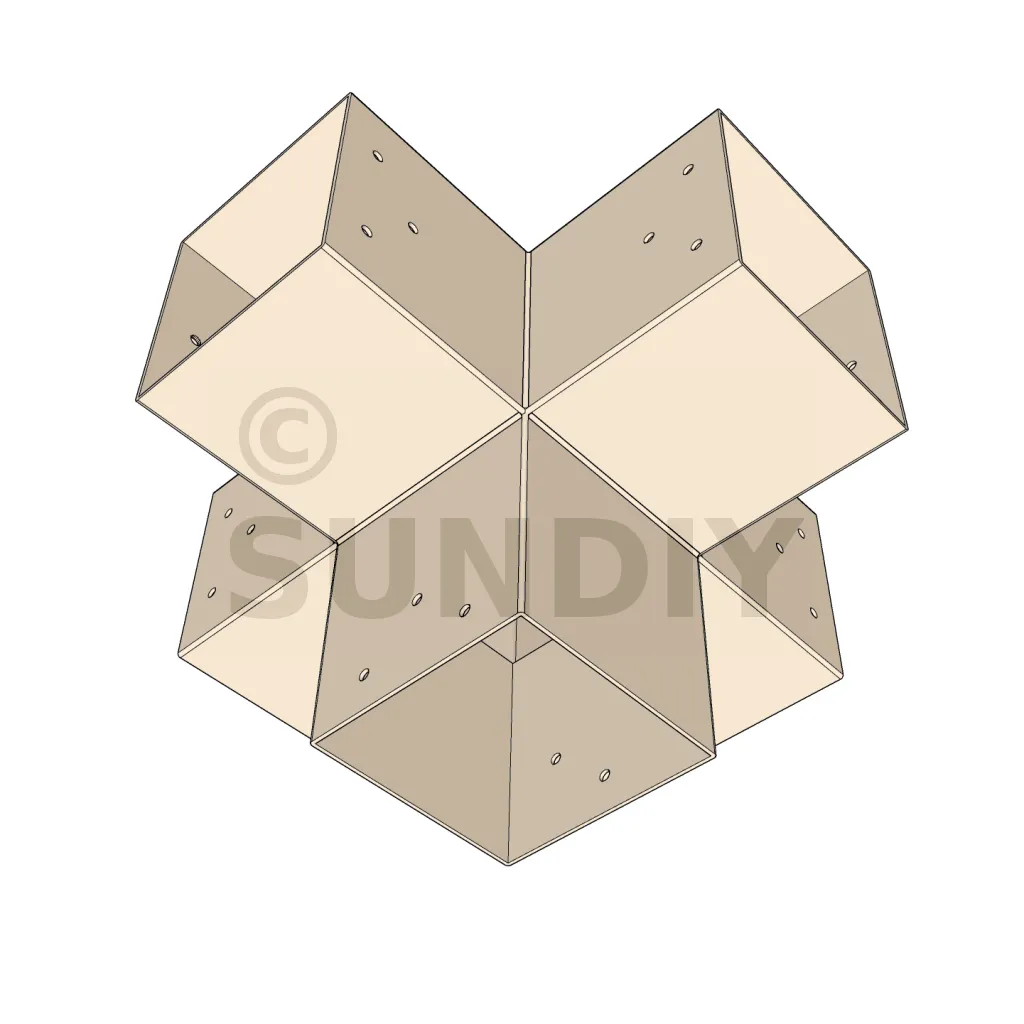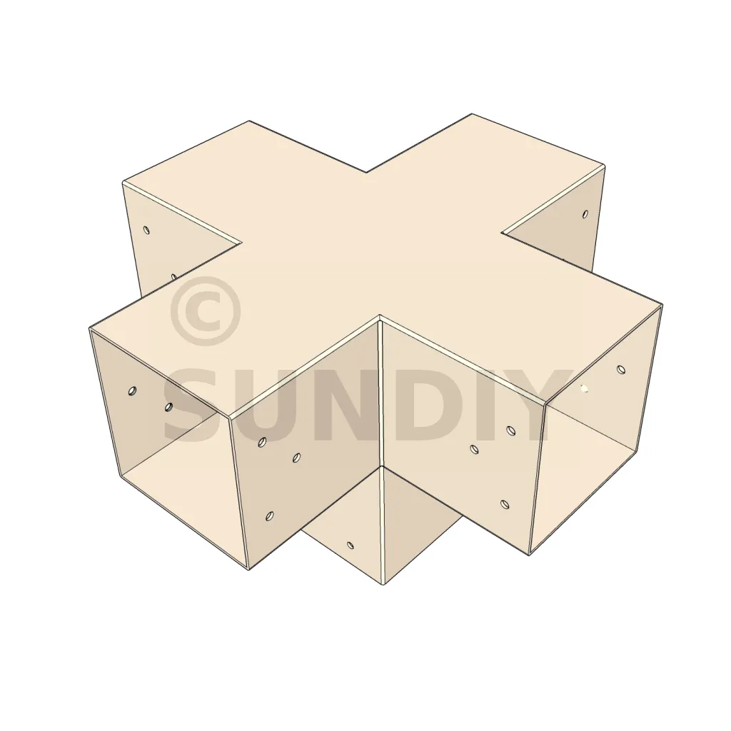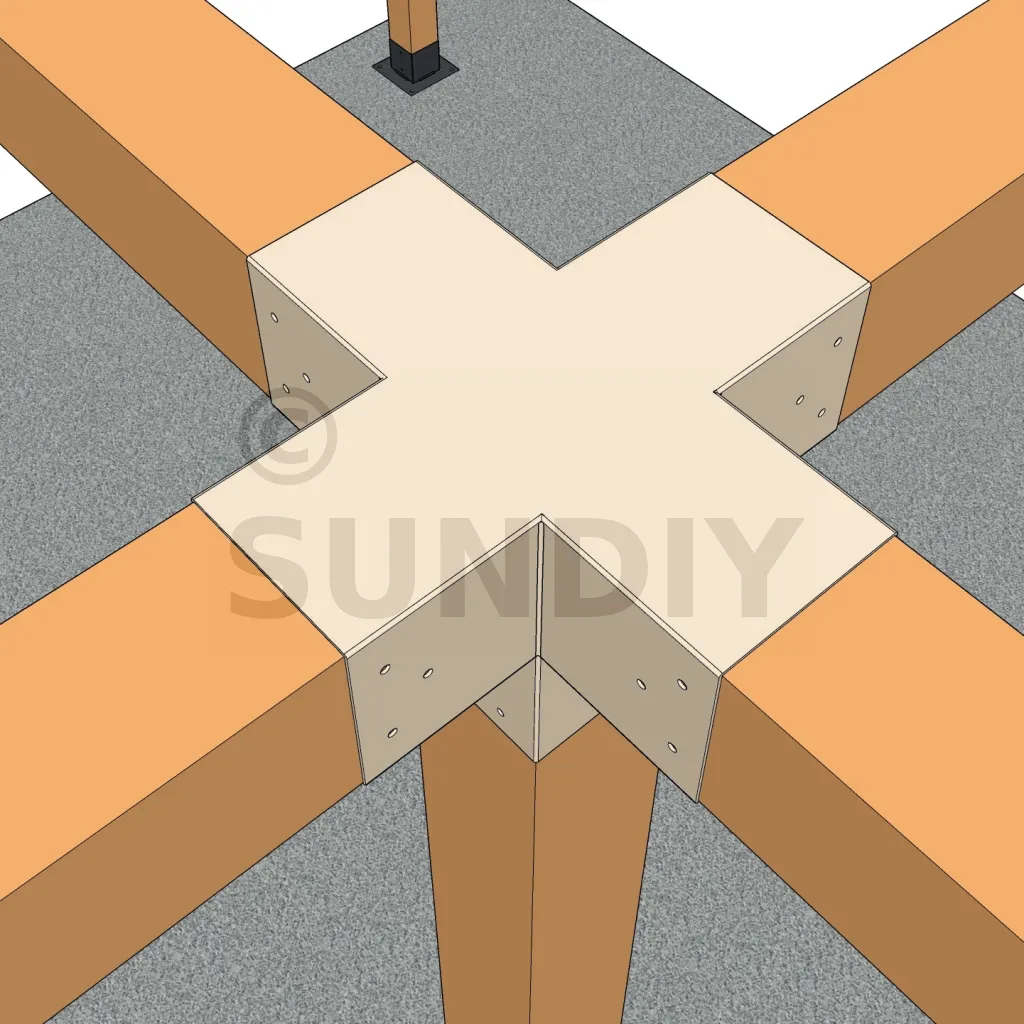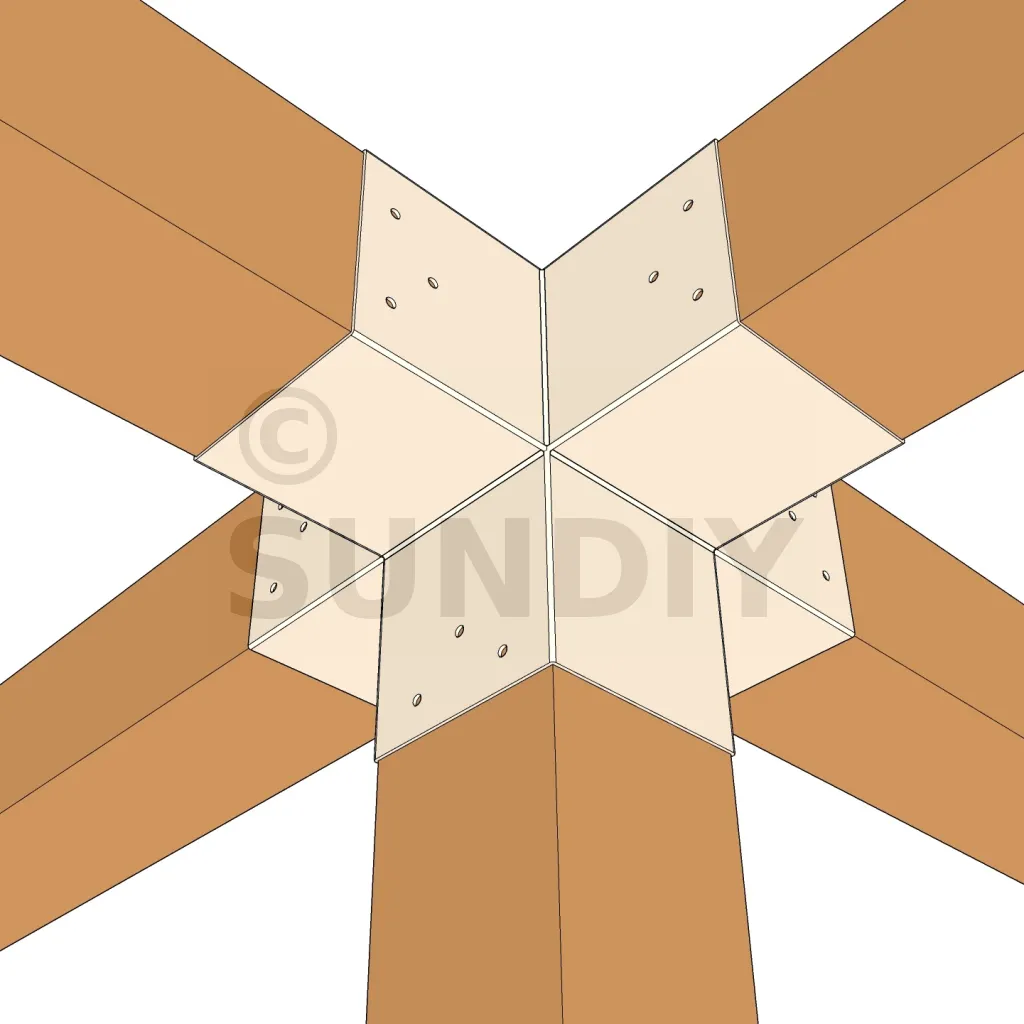 Il permet de raccorder deux poutres 120x120mm perpendiculairement à une autre poutre 120x120mm, le tout étant supporté par un poteau vertical de 120x120mm.