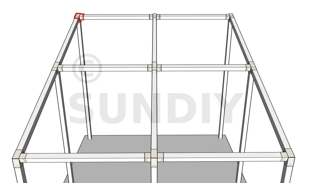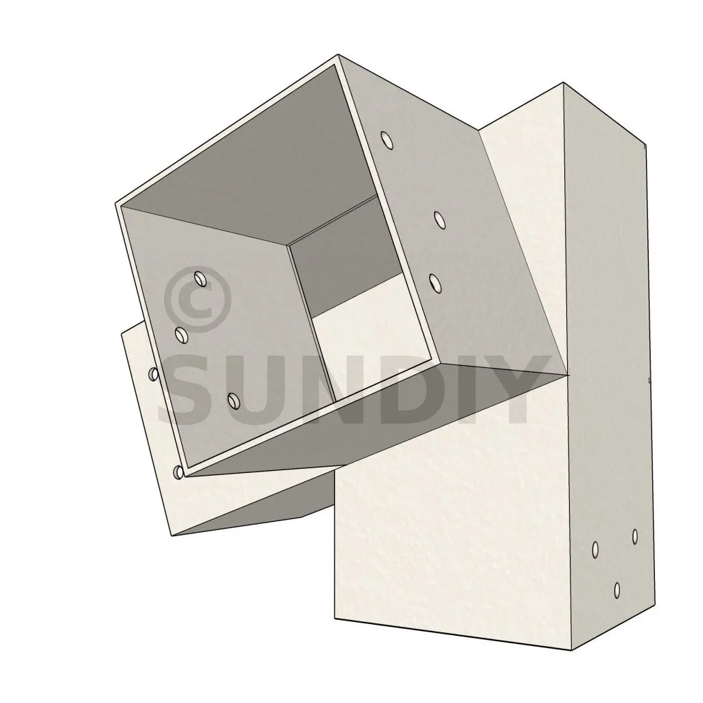 Il est utilisé dans un angle extérieur. Ce connecteur va permettre de raccorder une poutre 90x90mm à une poutre 90x90mm avec une pente de 20°, le tout étant supporté par un poteau vertical 90x90mm.