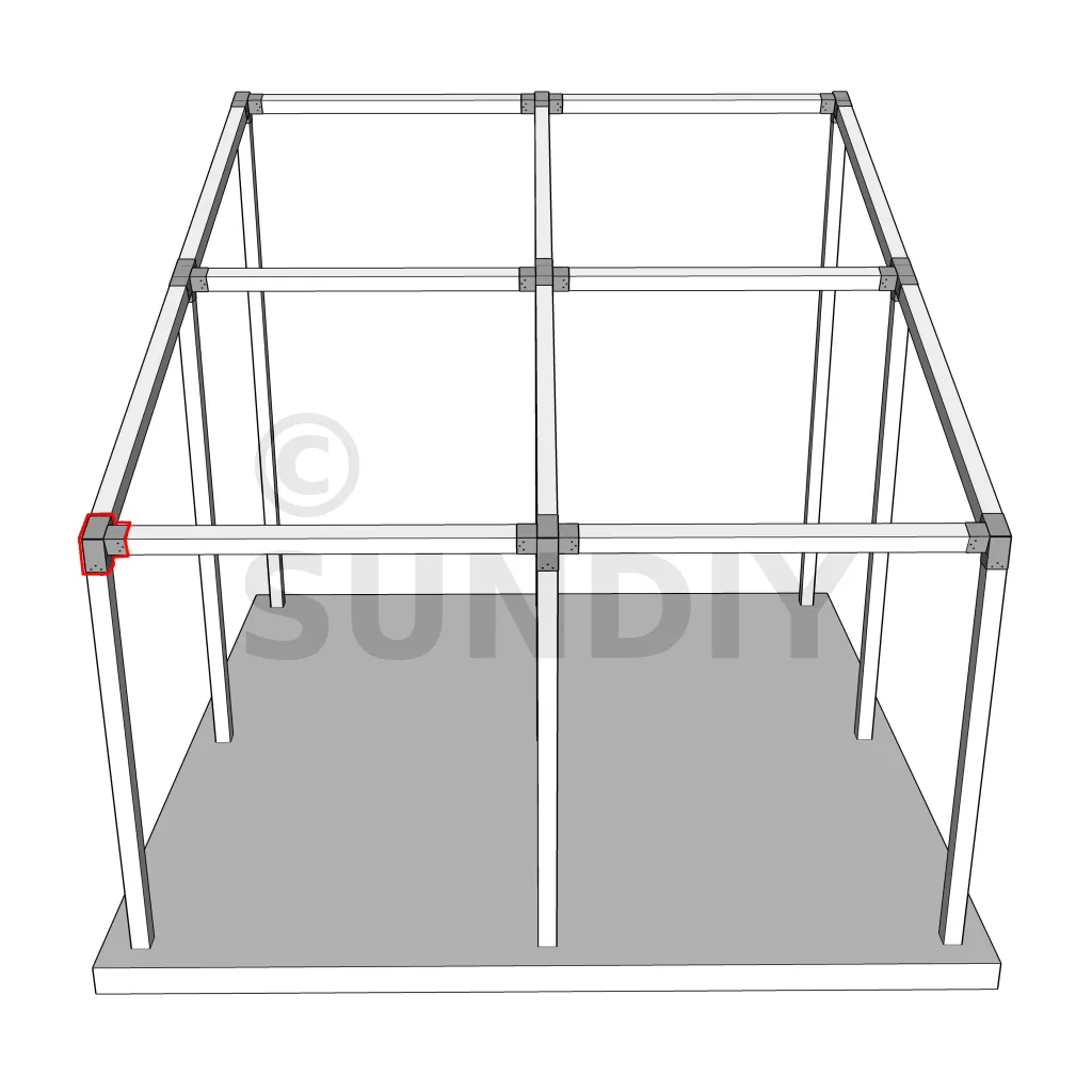 Il est utilisé dans un angle extérieur. Ce connecteur va permettre de raccorder une poutre 120x120mm à une poutre 120x120mm avec une pente de 20°, le tout étant supporté par un poteau vertical 120x120mm.
