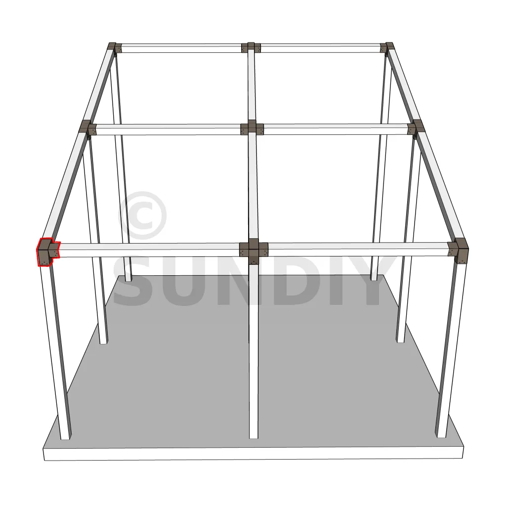 Il est utilisé dans un angle extérieur. Ce connecteur va permettre de raccorder une poutre 120x120mm à une poutre 120x120mm avec une pente de 20°, le tout étant supporté par un poteau vertical 120x120mm.