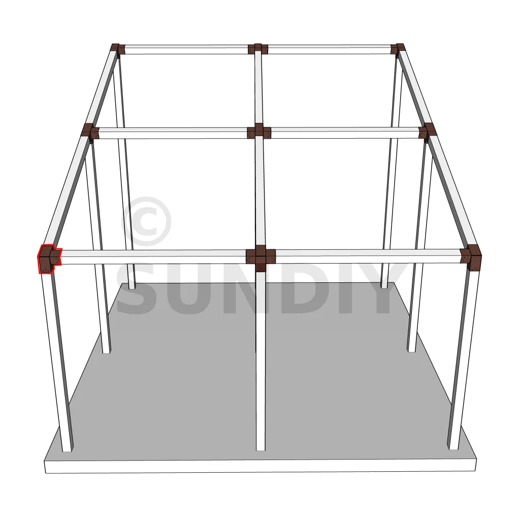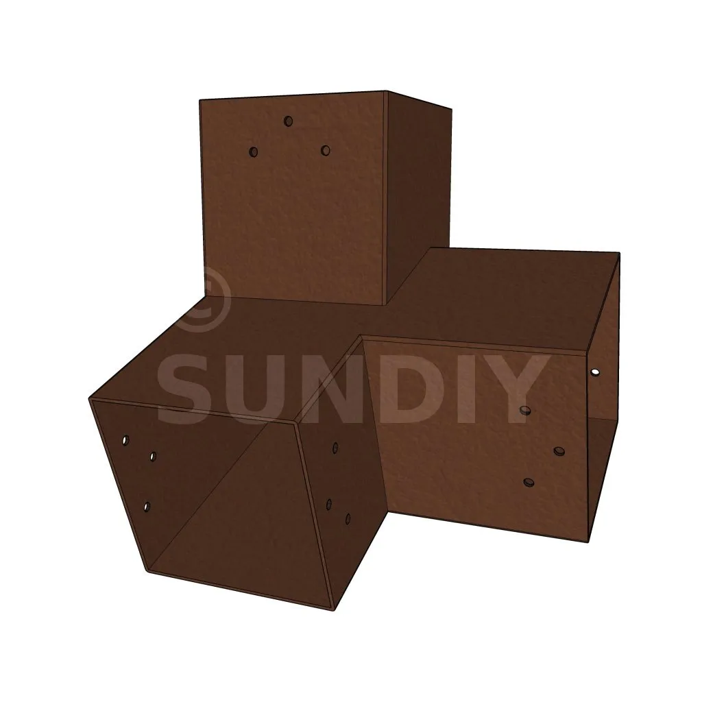 Il est utilisé dans un angle extérieur. Ce connecteur va permettre de raccorder une poutre 120x120mm à une poutre 120x120mm avec une pente de 20°, le tout étant supporté par un poteau vertical 120x120mm.