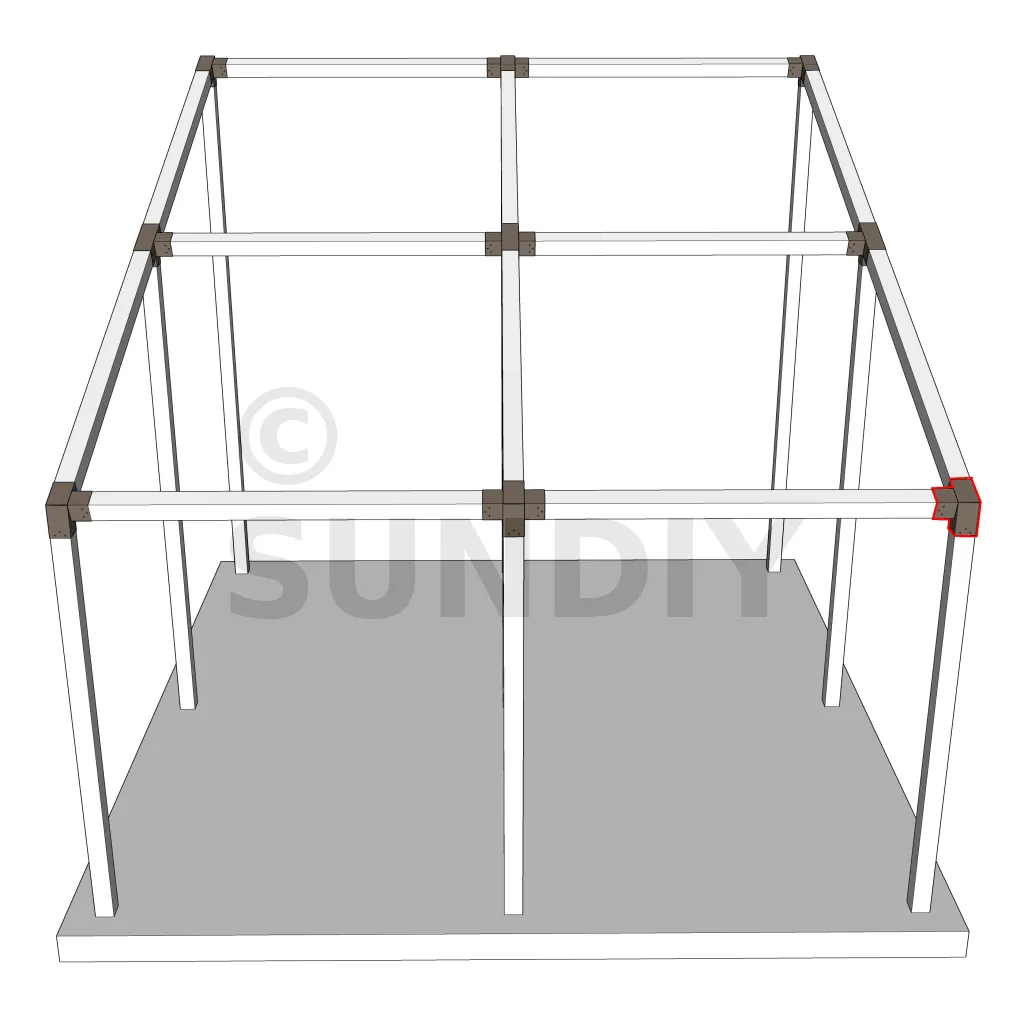 Il est utilisé dans un angle extérieur. Ce connecteur va permettre de raccorder une poutre 120x120mm à une poutre 120x120mm avec une pente de 20°, le tout étant supporté par un poteau vertical 120x120mm.