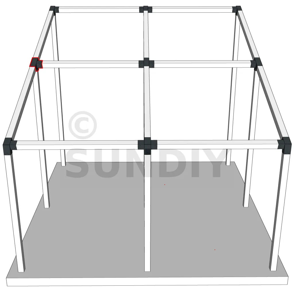 Connecteur d’angle intérieur à quatre directions, conçu pour l’assemblage de deux poutres en section 120x120 mm formant un angle de 20° avec un poteau vertical de même section. Il assure une liaison structurelle rigide et orthogonale à mi-hauteur, garantissant la stabilité de l’ensemble.