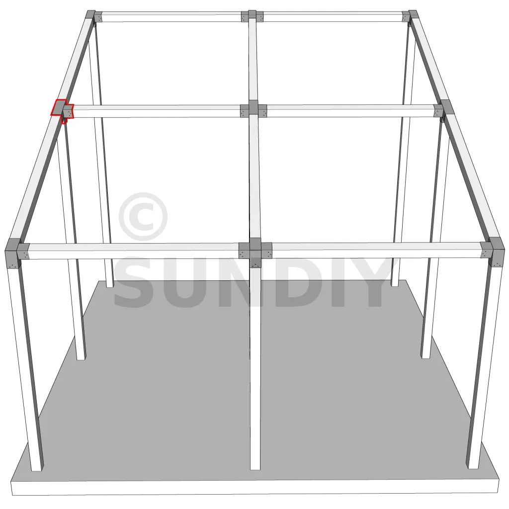Connecteur d’angle intérieur à quatre directions, conçu pour l’assemblage de deux poutres en section 120x120 mm formant un angle de 20° avec un poteau vertical de même section. Il assure une liaison structurelle rigide et orthogonale à mi-hauteur, garantissant la stabilité de l’ensemble.