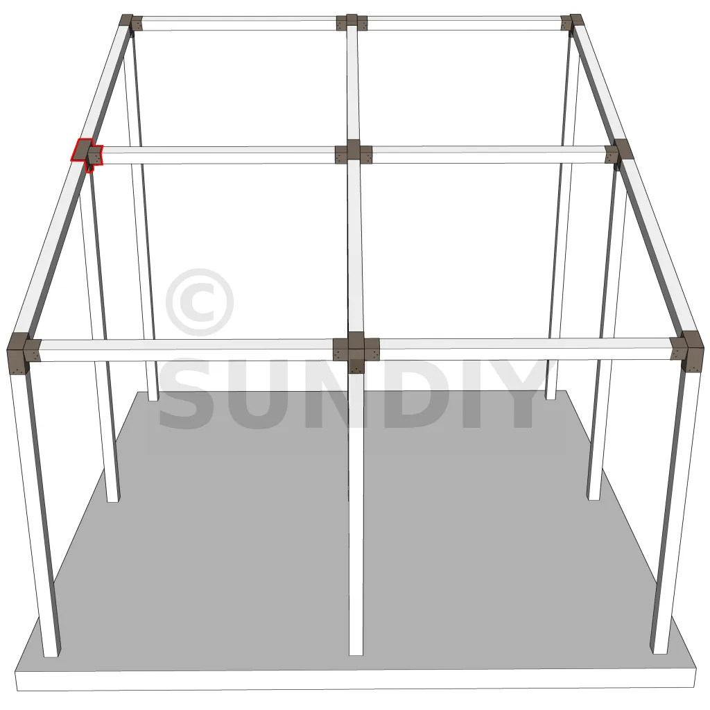 Connecteur d’angle intérieur à quatre directions, conçu pour l’assemblage de deux poutres en section 120x120 mm formant un angle de 20° avec un poteau vertical de même section. Il assure une liaison structurelle rigide et orthogonale à mi-hauteur, garantissant la stabilité de l’ensemble.