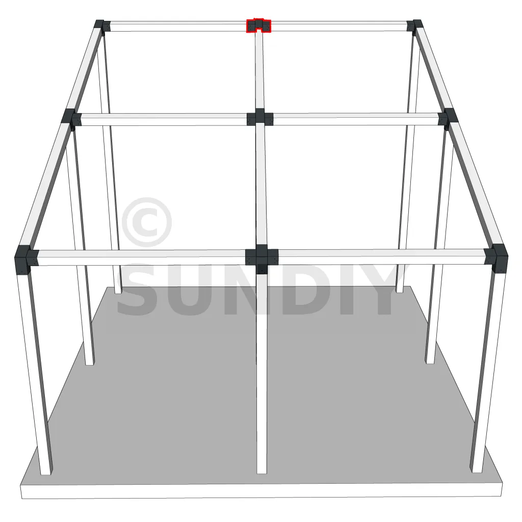 Connecteur d’angle intérieur à quatre directions conçu pour l’assemblage de poutres en section 120x120 mm avec un chevron de même section incliné à 20°. Il assure la jonction structurelle entre les éléments horizontaux, le chevron incliné et un poteau porteur vertical en 120x120 mm.