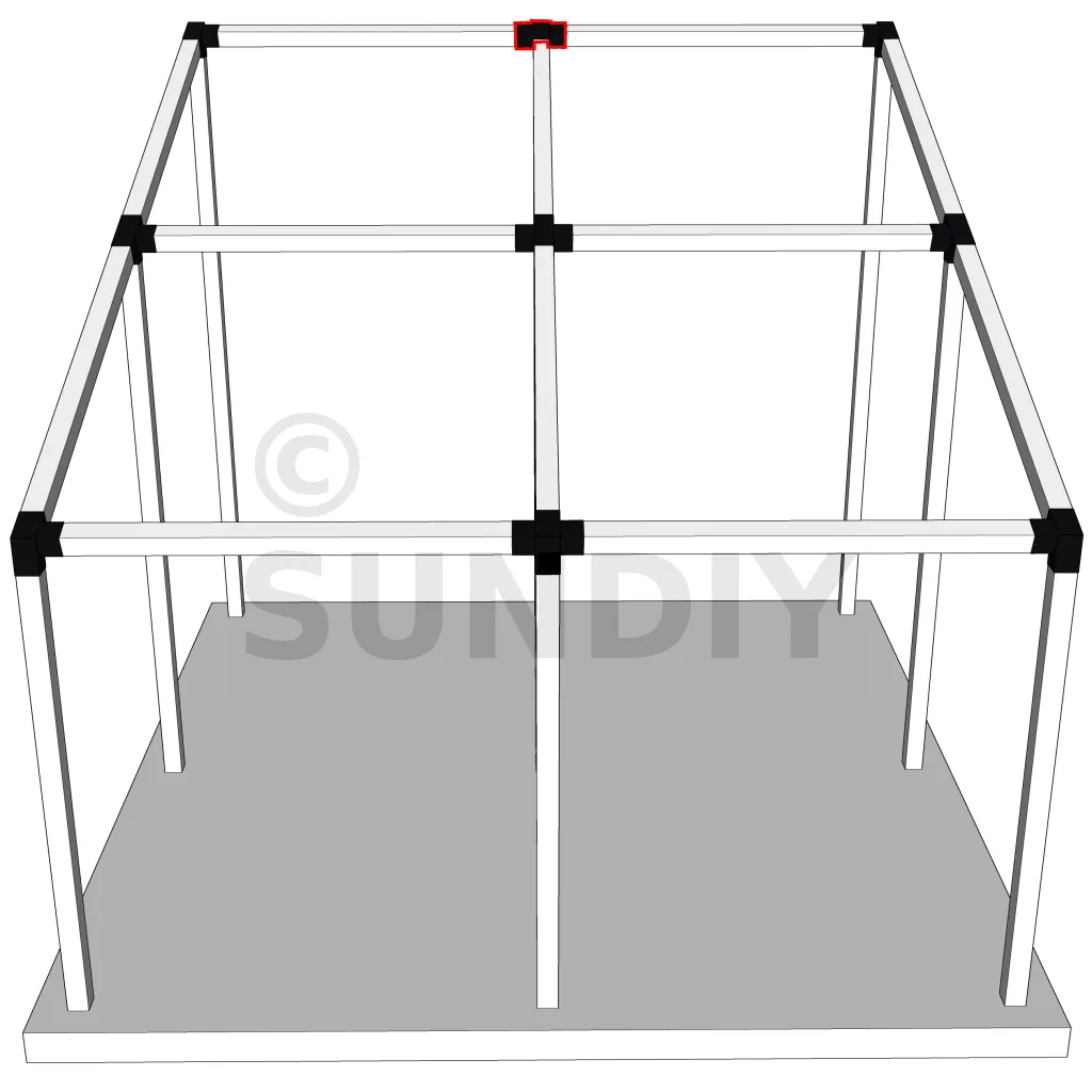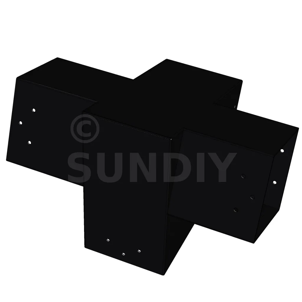 Connecteur d’angle intérieur à quatre directions conçu pour l’assemblage de poutres en section 120x120 mm avec un chevron de même section incliné à 20°. Il assure la jonction structurelle entre les éléments horizontaux, le chevron incliné et un poteau porteur vertical en 120x120 mm.