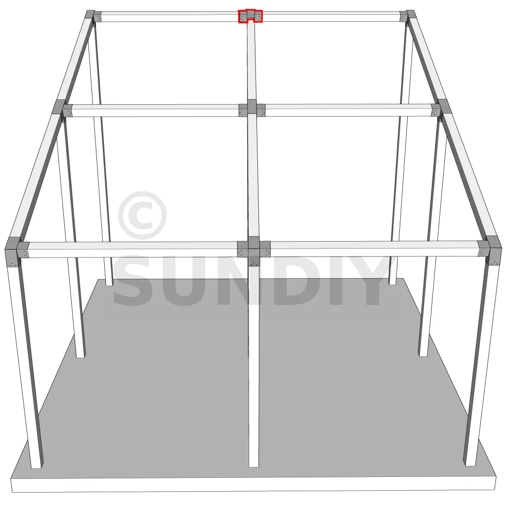 Connecteur d’angle intérieur à quatre directions conçu pour l’assemblage de poutres en section 120x120 mm avec un chevron de même section incliné à 20°. Il assure la jonction structurelle entre les éléments horizontaux, le chevron incliné et un poteau porteur vertical en 120x120 mm.