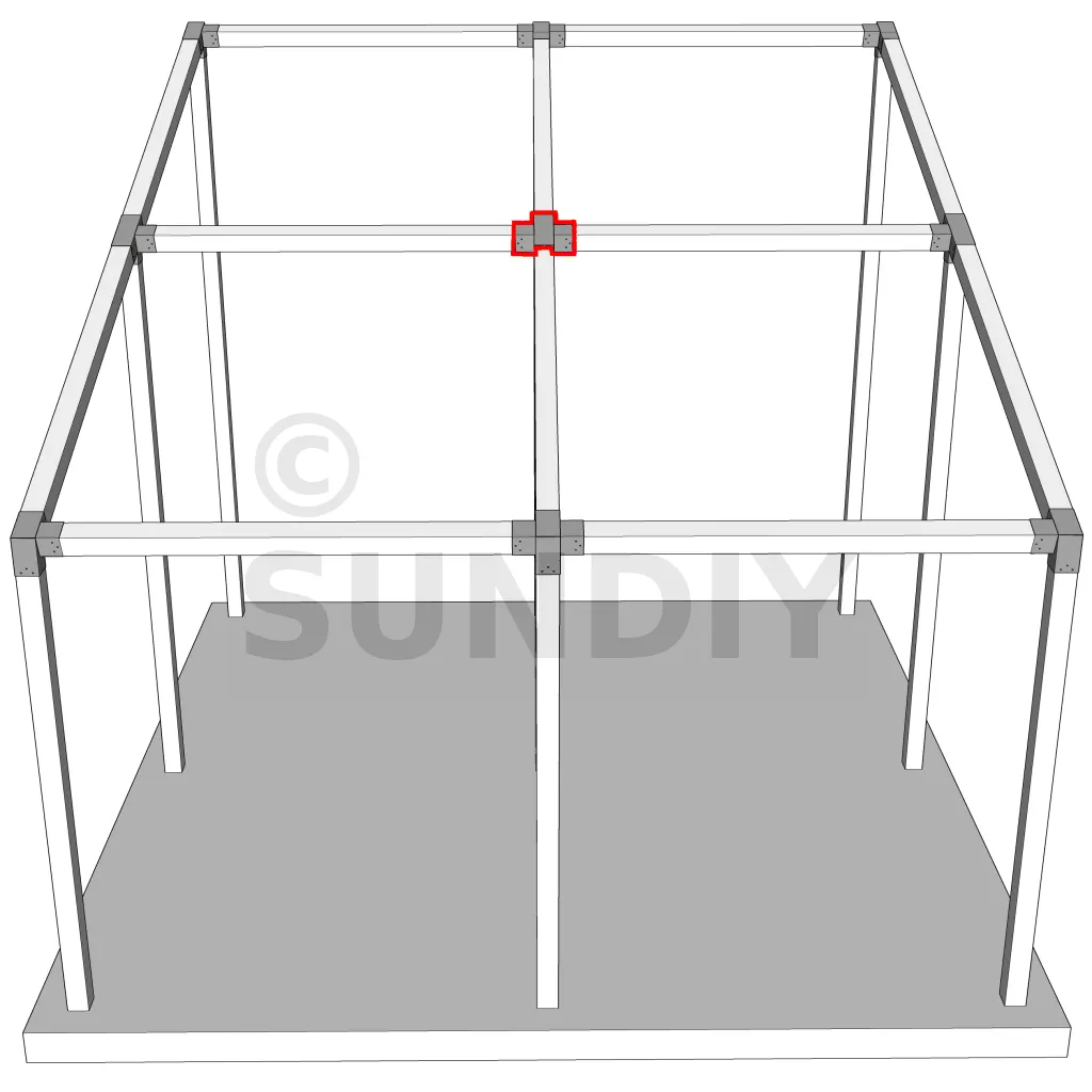 Connecteur métallique permettant l’assemblage précis de deux chevrons inclinés à 20°, de deux poutres horizontales et d’un poteau vertical central, tous de section 120x120 mm. Il garantit une liaison rigide et symétrique en un point central, assurant la stabilité de l’ensemble de la structure.