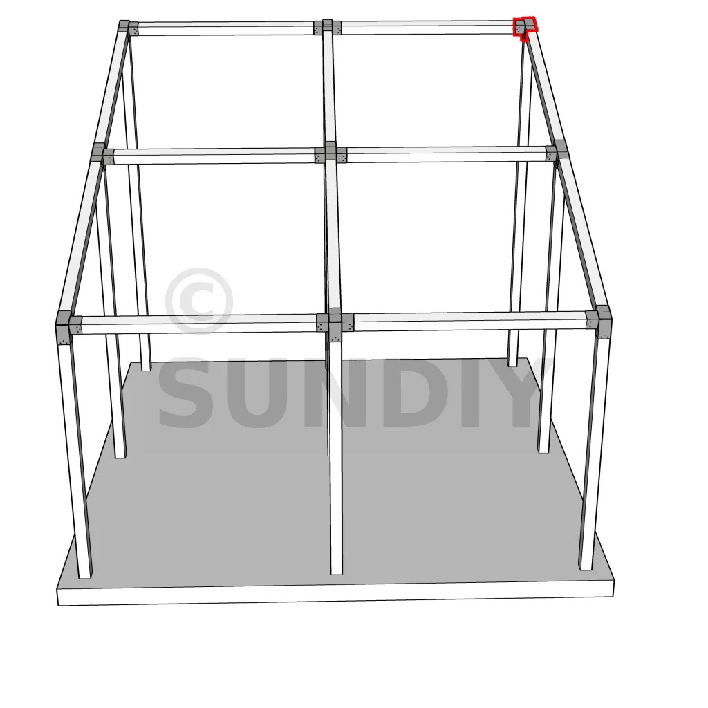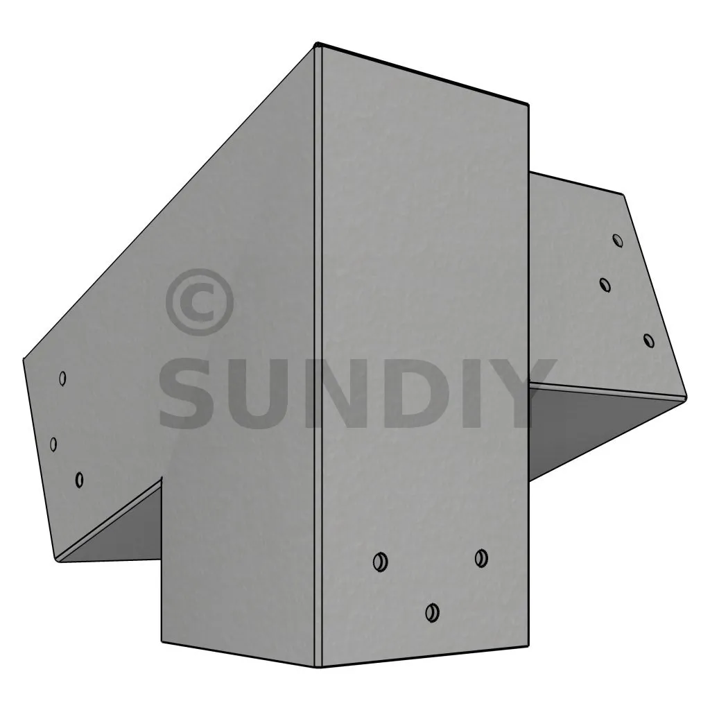 Il est utilisé dans un angle extérieur. Ce connecteur va permettre de raccorder une poutre 90x90mm à une poutre 90x90mm avec une pente de 20°, le tout étant supporté par un poteau vertical 90x90mm.