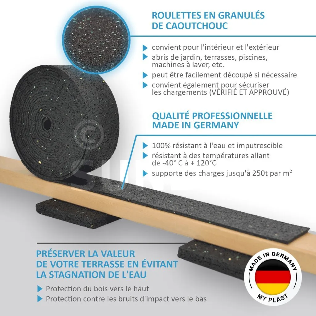 Protégez vos lambourdes et prolongez la durée de vie de votre terrasse grâce à ce rouleau en granulé de caoutchouc. Antidérapant, isolant et résistant aux intempéries, il offre une protection efficace contre l’humidité et facilite la pose de vos aménagements extérieurs.