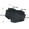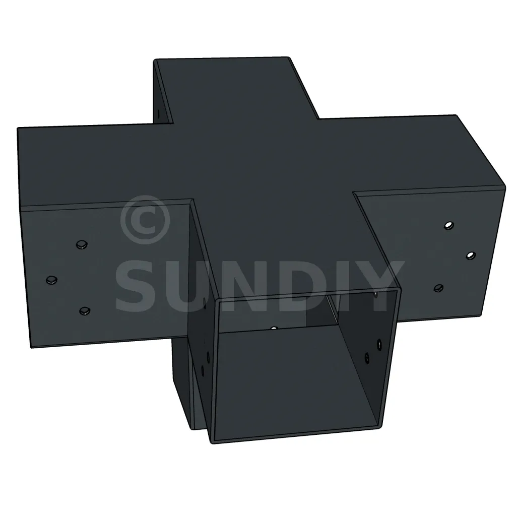 Connecteur métallique permettant l’assemblage précis de deux chevrons inclinés à 20°, de deux poutres horizontales et d’un poteau vertical central, tous de section 90x90 mm. Il garantit une liaison rigide et symétrique en un point central, assurant la stabilité de l’ensemble de la structure.