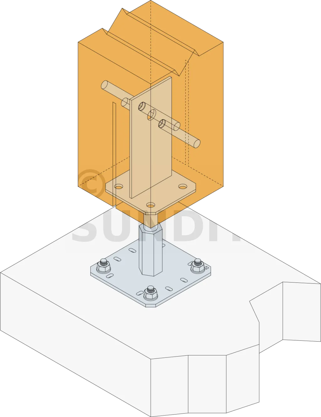 - Connexion bois sur support rigideSur poteau : 2 STD12 ; sur béton : 4Ø10 (goujons WA M10 ; tige filetée M10) ; sur acier : boulons