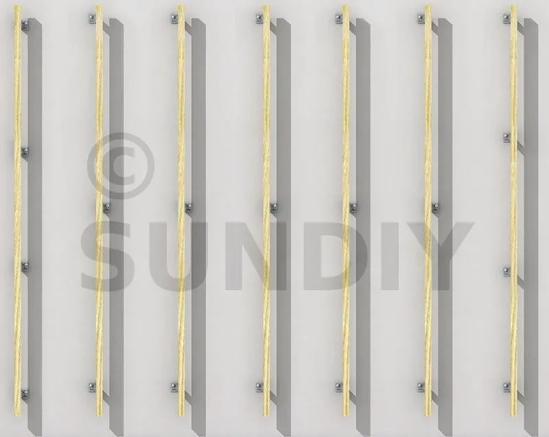 2. Disposition des équerres : en partie courante, la Mise en œuvre standard consiste à positionner les chevrons verticaux avec un entraxe de 60 cm. Ces chevrons sont fixés avec des équerres disposées en quinconce de part et d‘autre du chevron tous les 1,35 m soit 1,23 équerres/m². En rive de bâtiment, l‘espacement entre les équerres est réduit (0,90 m) et les équerres sont toutes placées du même côté sur le chevron d‘extrémité (voir schéma).