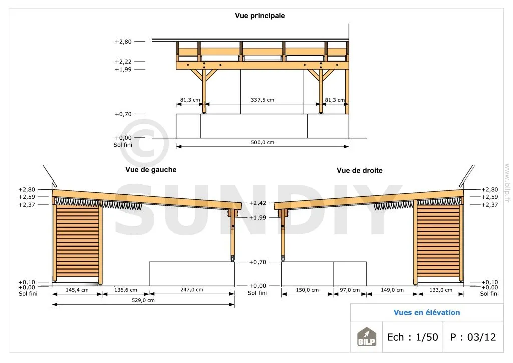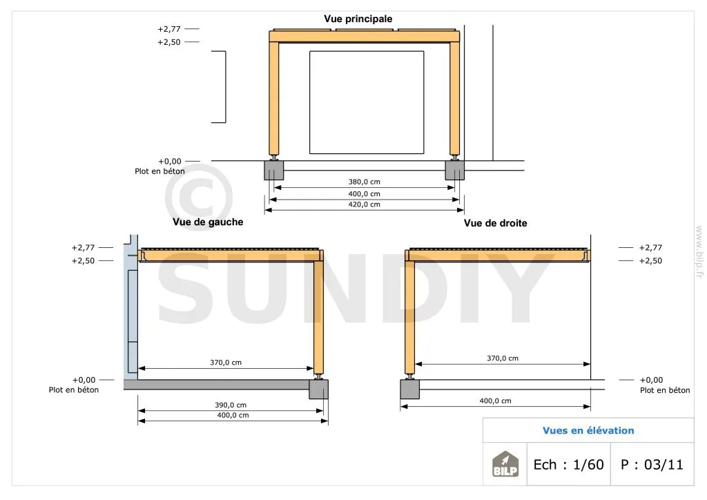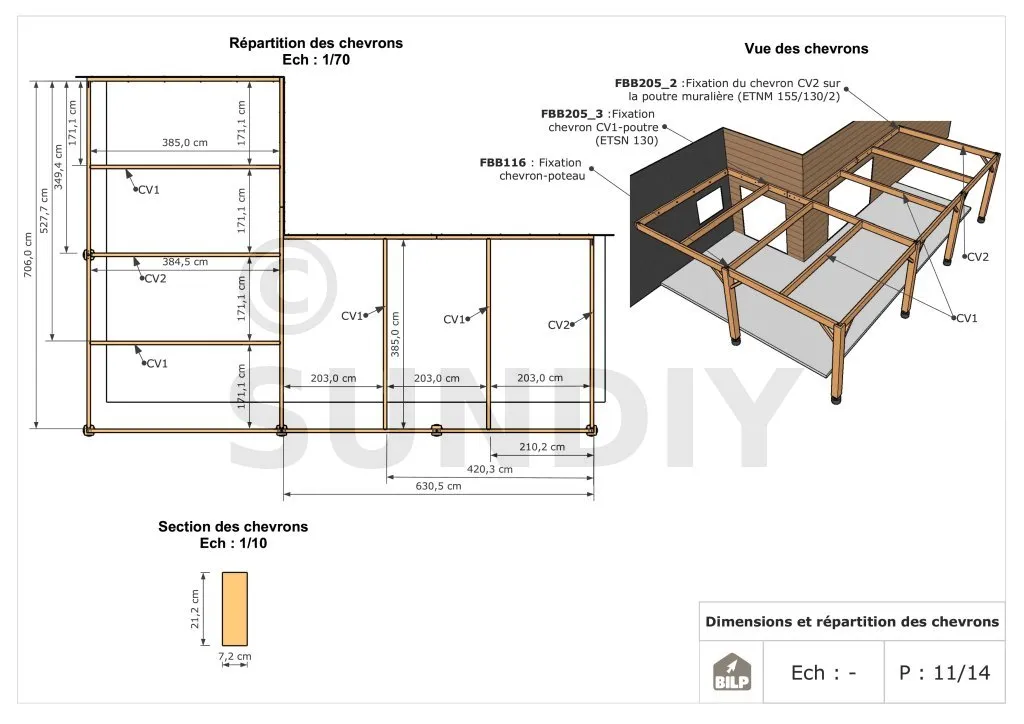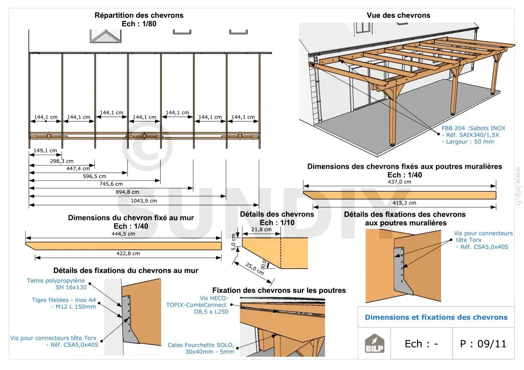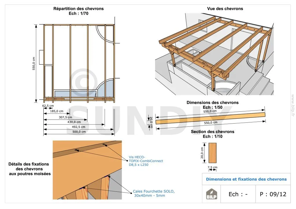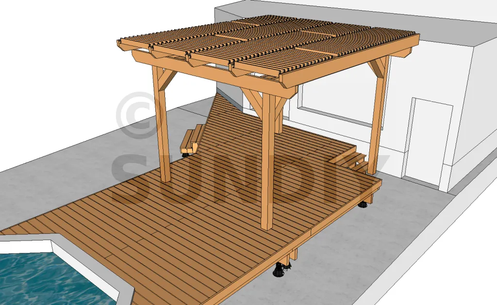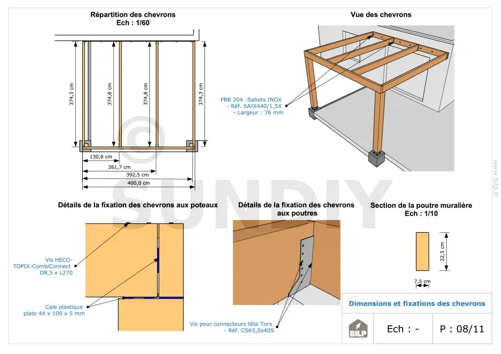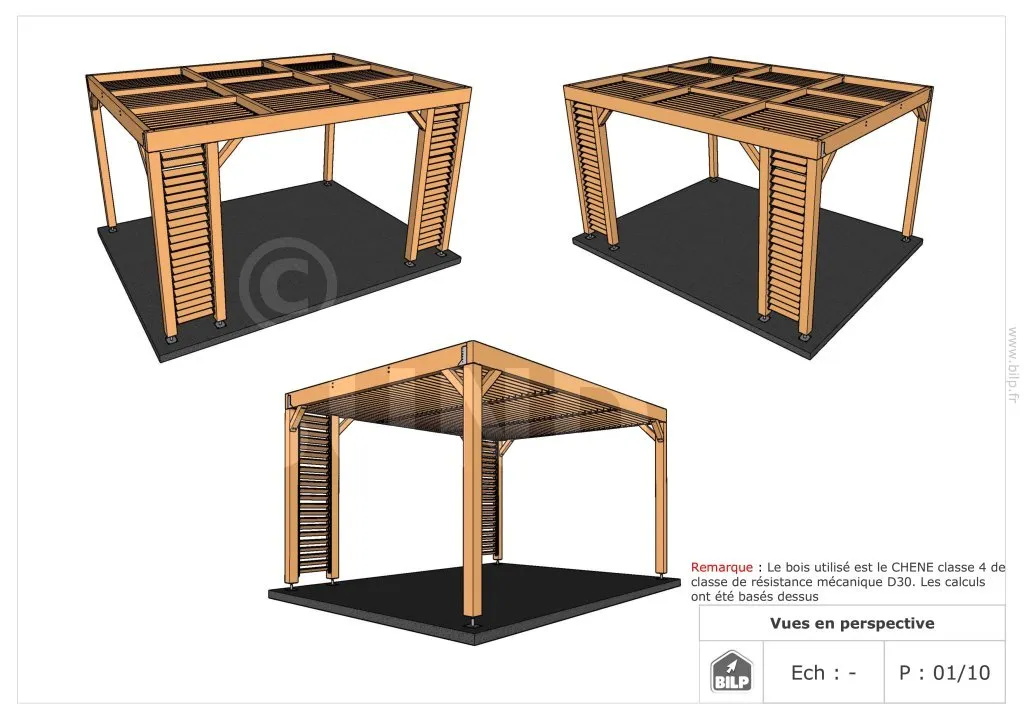 Les plans de structure à l’échelle sont faciles à lire et à comprendre. Ils vous permettrons de réaliser vous-même la structure de votre pergola. Les détails de réalisation sont indiqués. Nous calculons et optimisons les dimensions et les sections de pièces de bois.