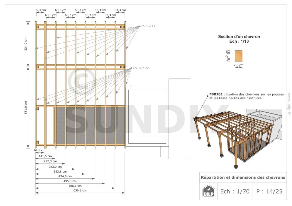 Les plans de structure à l’échelle sont faciles à lire et à comprendre. Ils vous permettrons de réaliser vous-même la structure de votre projet. Les détails de réalisation sont indiqués. Nous calculons et optimisons les dimensions et les sections de pièces de bois.