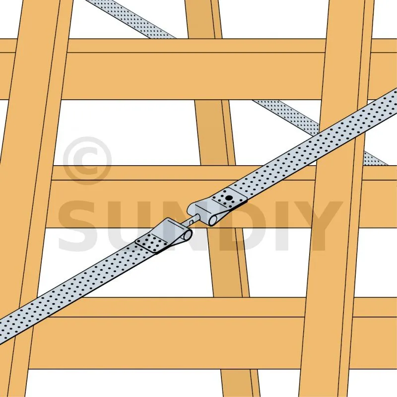 3. Fixer l’autre extrémité de ces deux feuillards au tendeur FMBS afin de les associer au centre de la diagonale.
