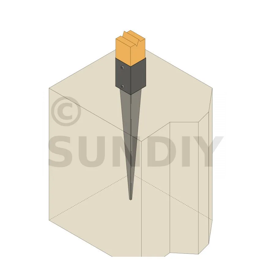 Pré-creuse un logement cylindrique avec une barre à mine ou une tarière manuelle, puis enfonce le piquet au marteau à piquer. Pour les terrains sableux, humidifie le sol avant de frapper : le sable se compacte mieux.