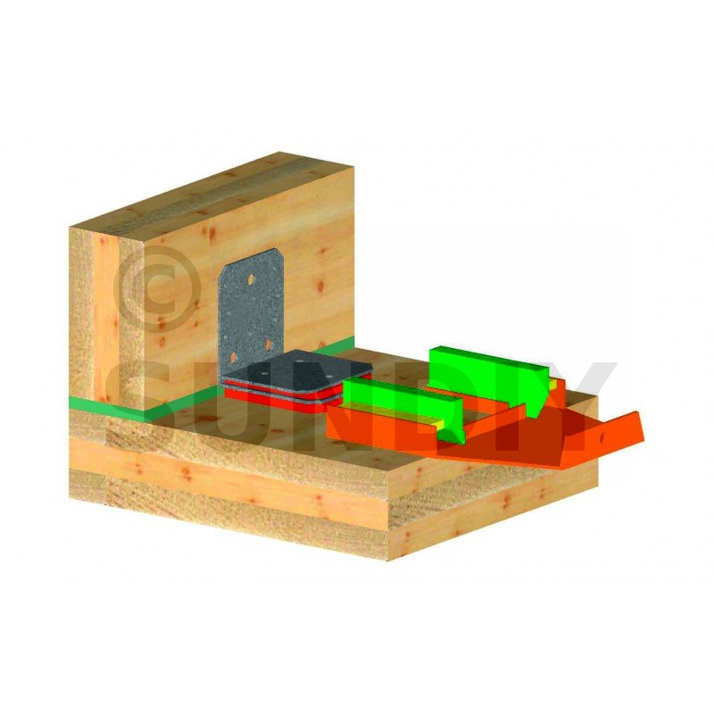 L’équerre acoustique ABAI est une équerre innovante car elle associe une équerre classique à un matériau d’isolation acoustique, la Sylodyn®. Elle permet la connexion entre éléments de mur et de plancher en panneaux multiplis (CLT), tout en garantissant une isolation phonique entre ces composants grâce à une bande de Sylodyn® de 12 mm préinstallée sous l’équerre.