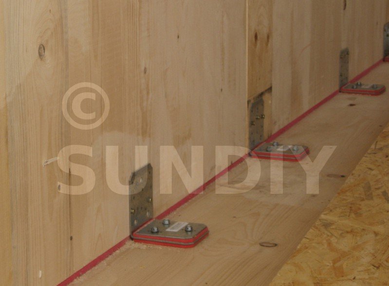 Pour une efficacité totale, la présence d’une bande Sylodyn® sous les panneaux murs CLT est impérative. Le choix des bandes Sylodyn® dépend du poids du mur (voir tableau ci-dessous). Un gabarit de montage (réf. MOABAI) est disponible pour une meilleure pose de l’équerre ABAI. Il évite en effet la compression de la bande de Sylodyn® présente sous l’équerre.