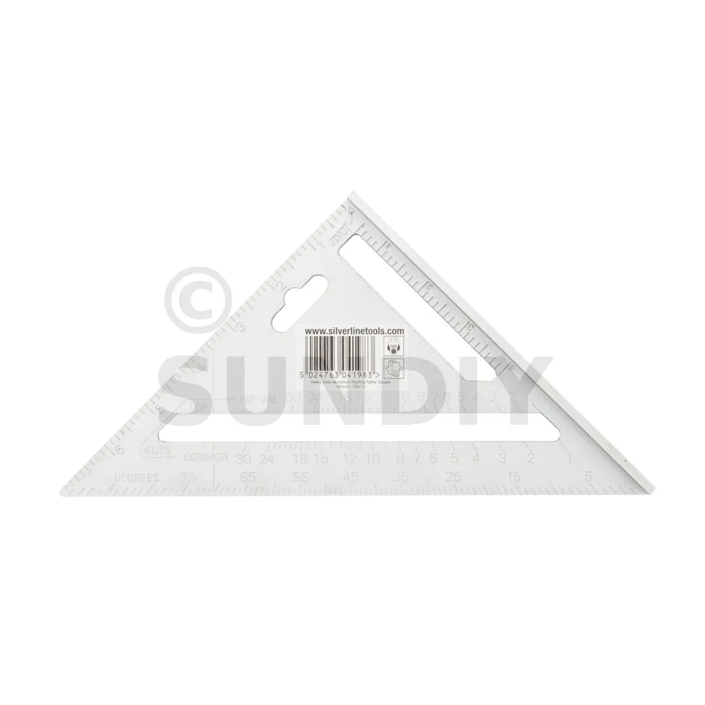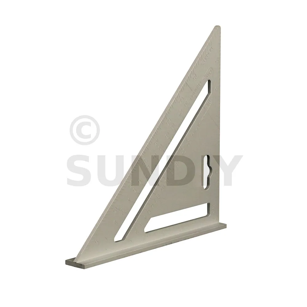 Équerre à corps robuste en alliage d’aluminium moulé, graduations impériales en relief faciles à lire, et table de conversion pour la pose de chevrons. À bords relevés pour une localisation sure. Échelle de rapporteur 0-90°. À utiliser comme guide lors du sciage pour les mesures d’angle et les coupes. Poids 125 g. Dimensions : 185 x 185 x 260 mm.