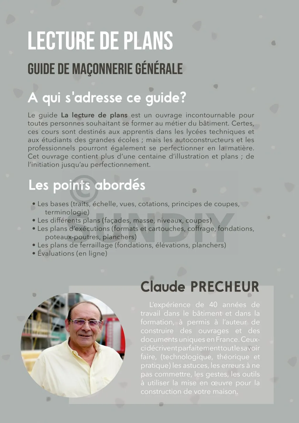 L’expérience de 40 années de travail dans le bâtiment et dans la formation, a permis à l’auteur de construire des ouvrages et des documents uniques en France. Ceux-ci décrivent parfaitement tout le savoir faire, les astuces, les erreurs à ne pas commettre, les gestes, les outils à utiliser et la mise en œuvre pour la construction de votre maison. Que ce soit la construction principale, les annexes, les extensions, la rénovation ou les simples travaux d’extérieur. Le tout pédagogiquement afin que chacun d’entre nous puisse comprendre et mettre en pratique les conseils fournis.