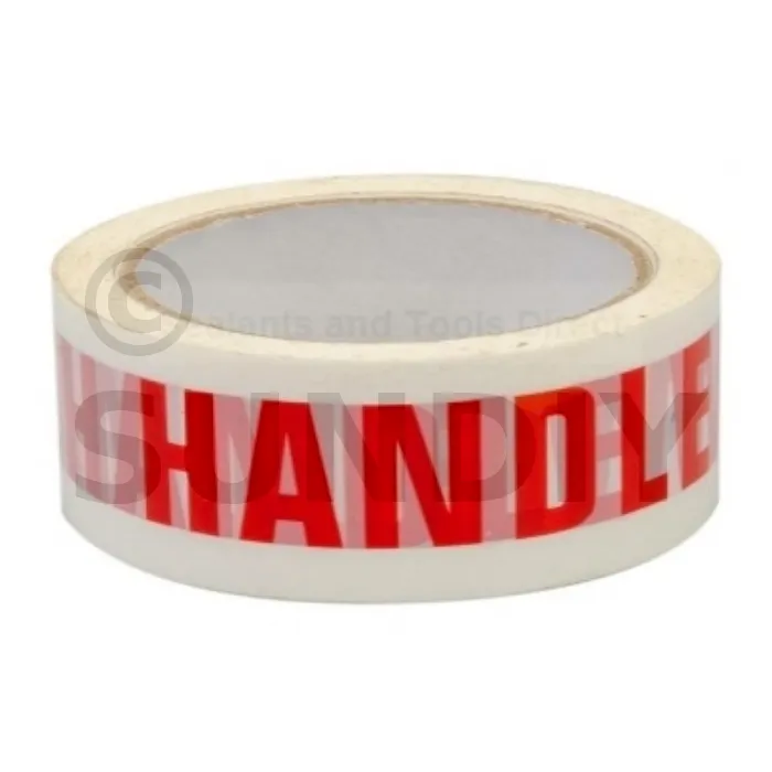 Lettres rouges sur fond blanc indiquant la mention en anglais HANDLE WITH CARE