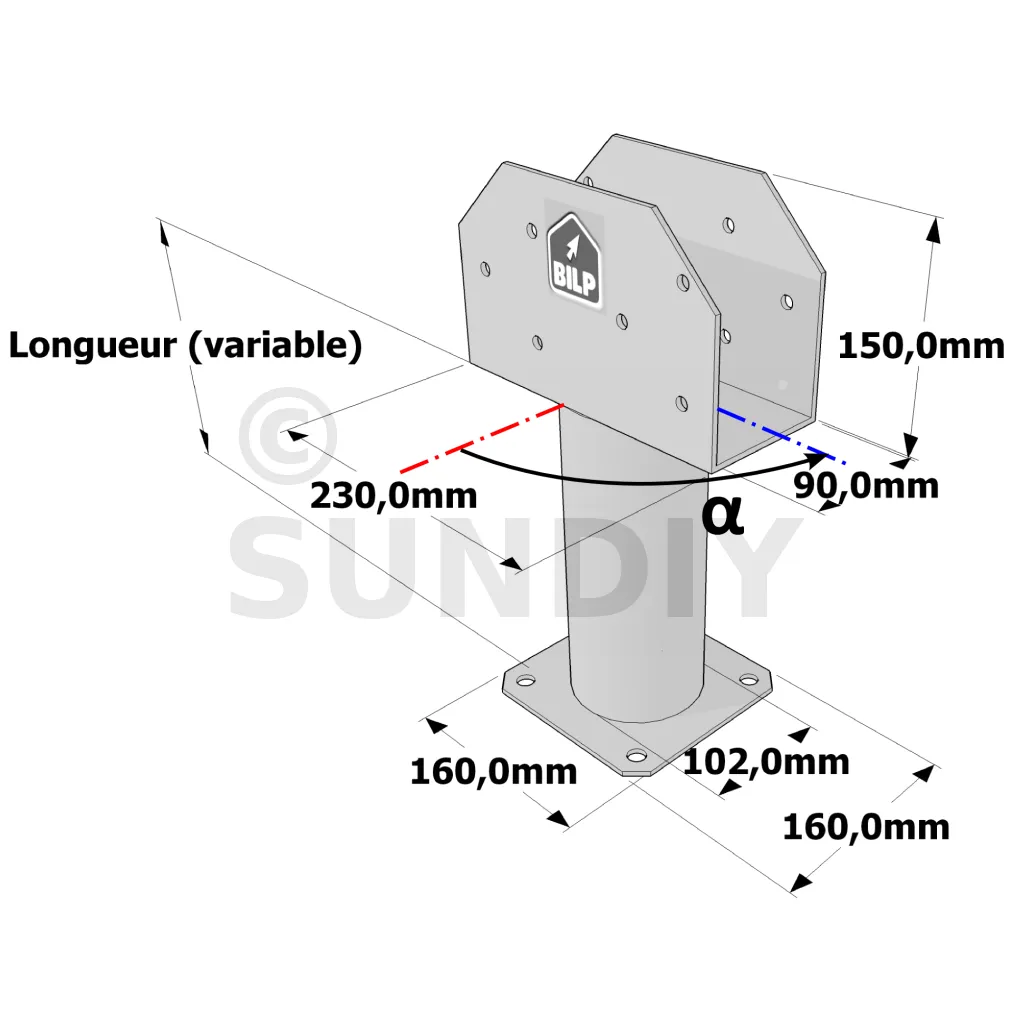 Poteau structurel OSP - D102mm - Platine haute en U 90x230x150mm - Embase 160x160mm
