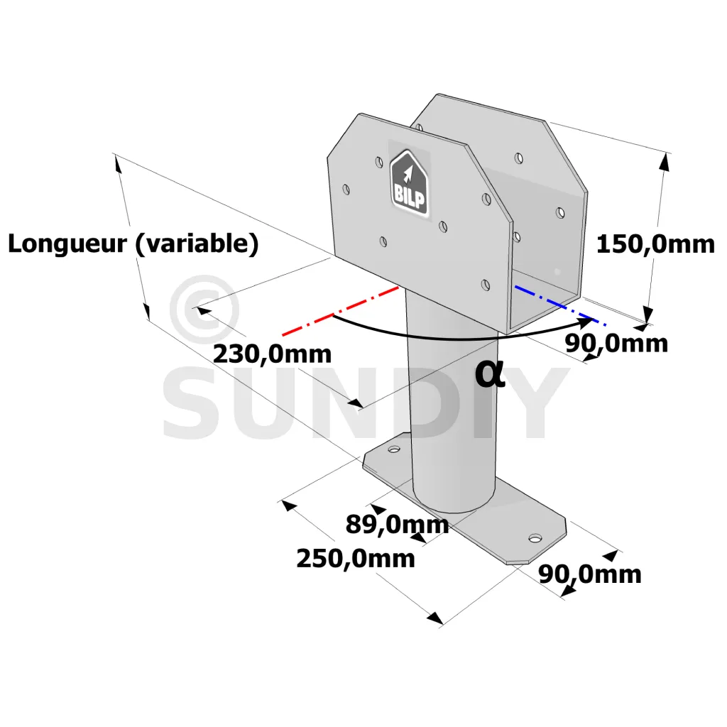 Poteau structurel OSP - D89mm - Platine haute en U 90x230x150mm - Embase rectangulaire 90x250mm