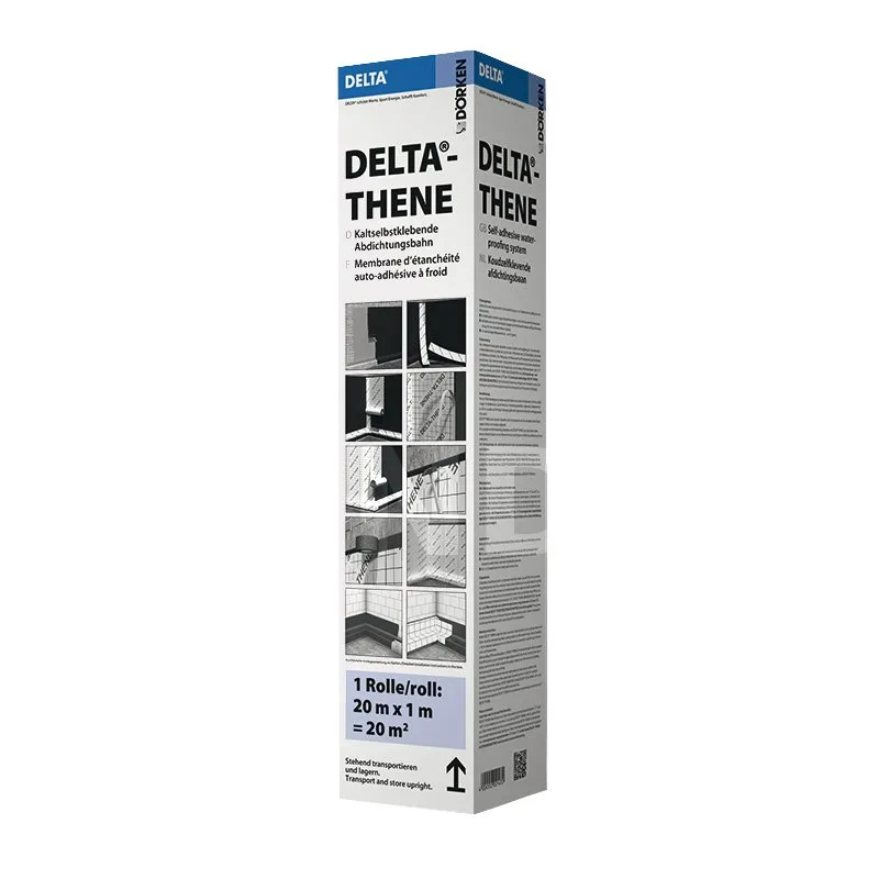 - DELTA®-THENE est un produit d’étanchéité rapide et facile à poser. Il est appliqué sur une paroi préalablement traitée avec le primaire d’accrochage PRIMER DELTA®-THENE. Sa structure quadrillée de 10 cm permet une découpe facile et précise des bandes à l’aide d’un cutter. Il est adapté à toutes les tranchées, même les plus étroites, et offre une étanchéité durable et fiable.